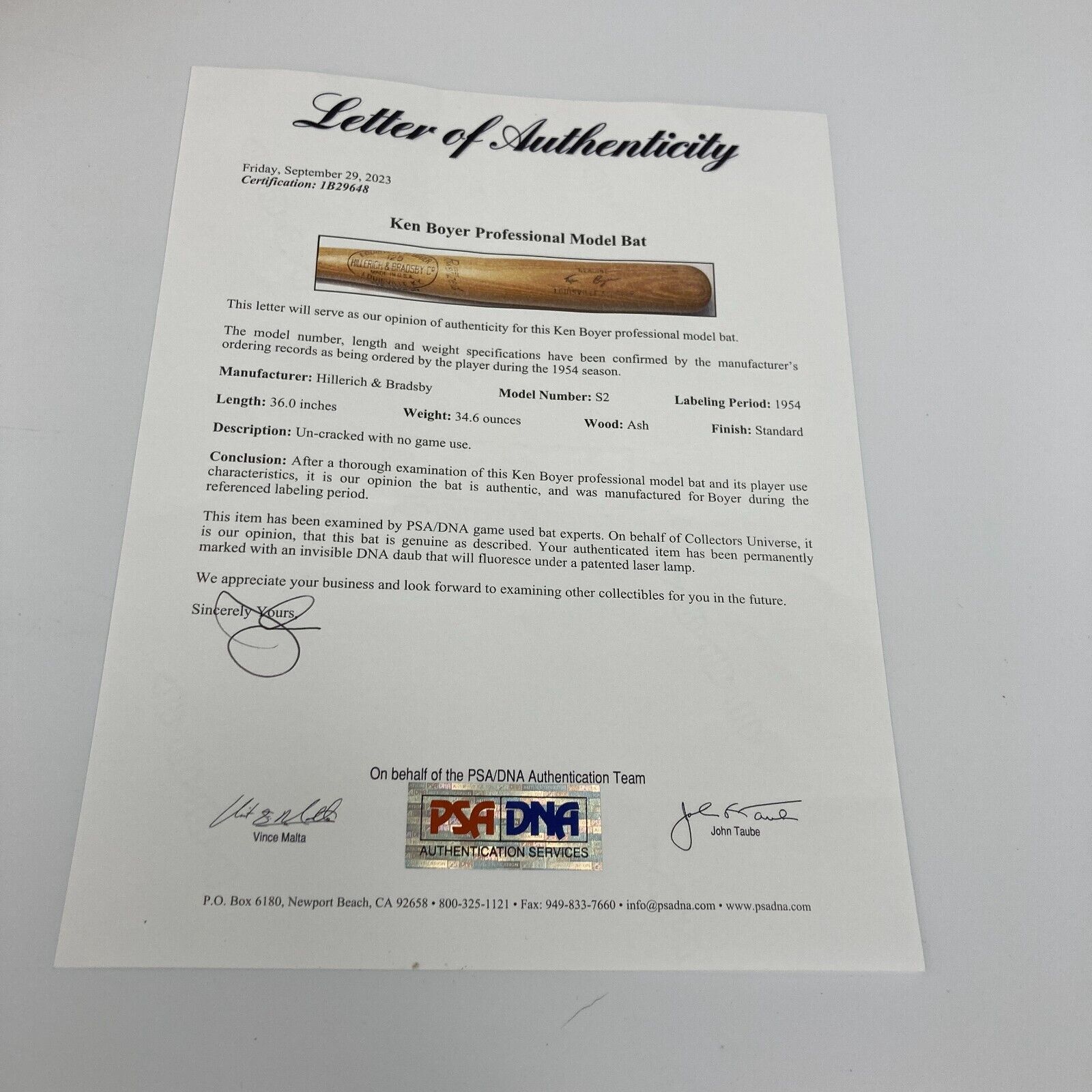 Ken Boyer H&B signature-model ("S2") bat dating from the 1954 manufacturing period. Deemed Authentic by PSA/DNA. The absence of a numerical grade is predicated solely upon the fact that the bat shows no use, but PSA/DNA has asserted in its letter of authenticity that the bat meets the specifications of those ordered by Boyer during the referenced labeling period. Aside from its lack of use, the bat is a picture-perfect Boyer pro-model bat. The bat is not cracked and is in Excellent condition overall, with a PSA/DNA sticker (bat authentication) affixed to the handle. The bats model number ("S2") is stamped in the knob end. Boyer debuted with the Cardinals on April 12, 1955, and his rookie campaign foreshadowed his stellar career. The slick-fielding third baseman batted .264 with 18 home runs and 62 RBI in 1955. Boyer remained a fixture in the Cardinals lineup for the next ten years. During that span he appeared in seven All-Star Games, won five Gold Glove Awards, and was voted the National League's Most Valuable Player in 1964. He finished his career in 1969 with 282 home runs, 1,141 RBI, and a .287 lifetime batting average. Length: 36 inches. Weight: 34.6 ounces. Full LOA from John Taube of PSA/DNA.
