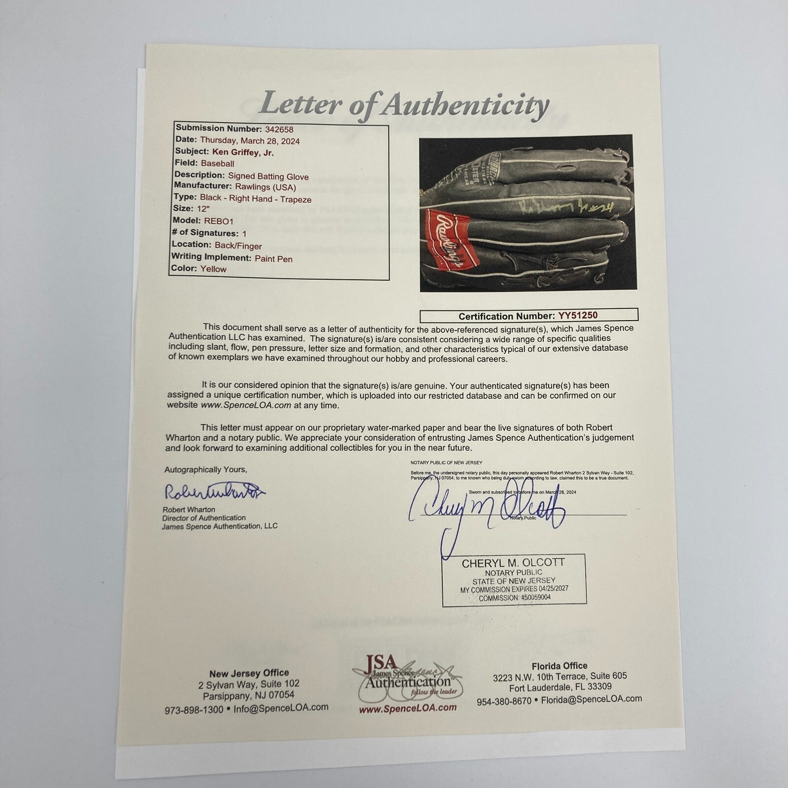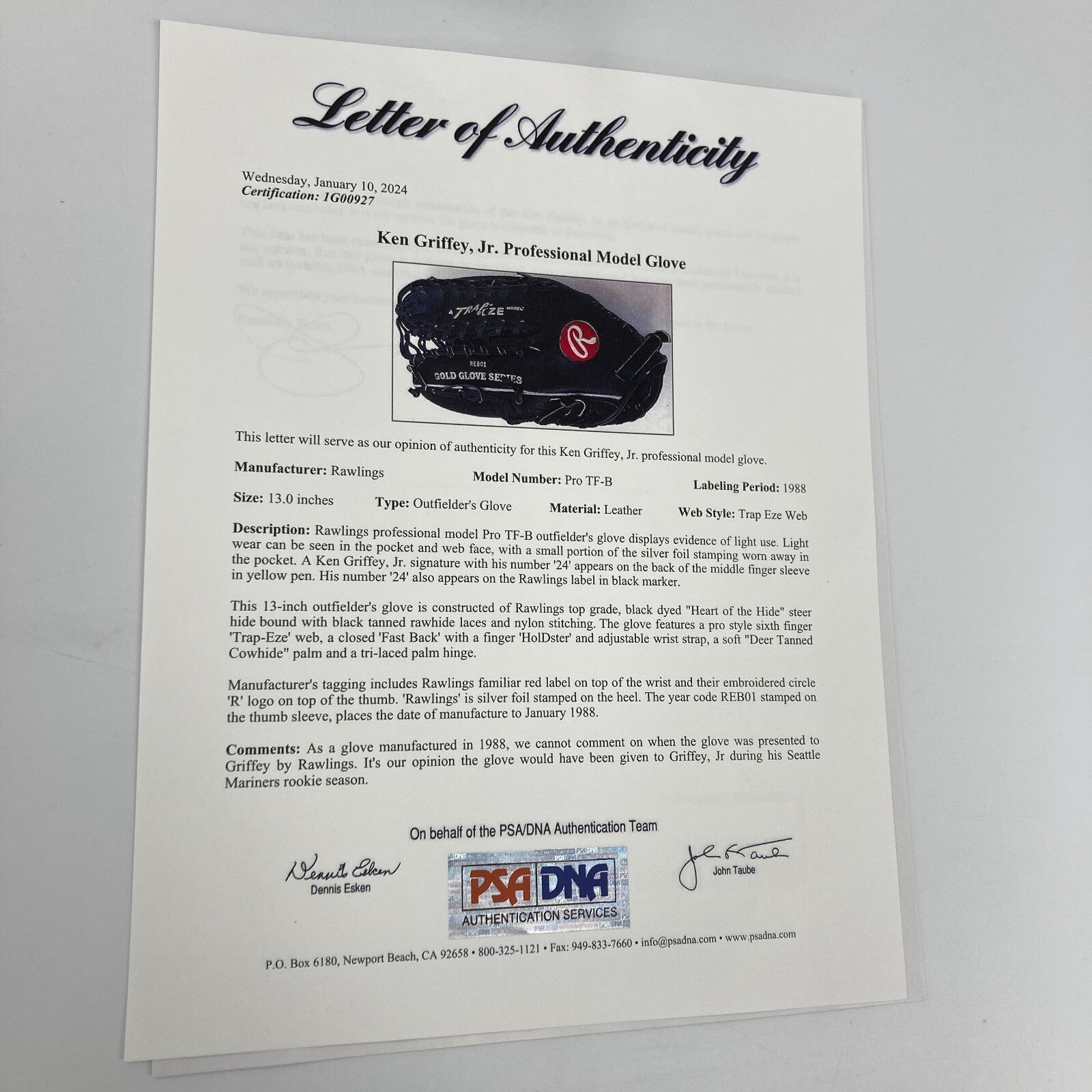 1989 Ken Griffey Jr. Seattle Mariners signed game used fielder's glove includes a vintage rookie signature with #24 inscription. Rawlings Pro TF-B Trap-Eze model glove shows light but definite game use with wear evident to some of the silver lettering in the palm of the black glove. Circular Rawlings "R" logo is below thumb, square logo patch is sewn to the base of the fingers with Junior's number 24 written in black marker. Comes with full letter COA from PSA DNA for the game use and a full letter COA from JSA for the signature.