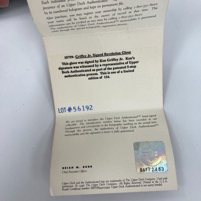 Ken Griffey Jr. personal model Rawlings Revolution JR24SO fielder's mitt which has been signed in silver marker by Griffey with an Upper Deck hologram and COA attending. "Ken Griffey Jr." custom embroidered on thumb with the original Rawlings Revolution Series and Ken Griffey Jr. personal model signature tags still affixed. Numbered 64/124.