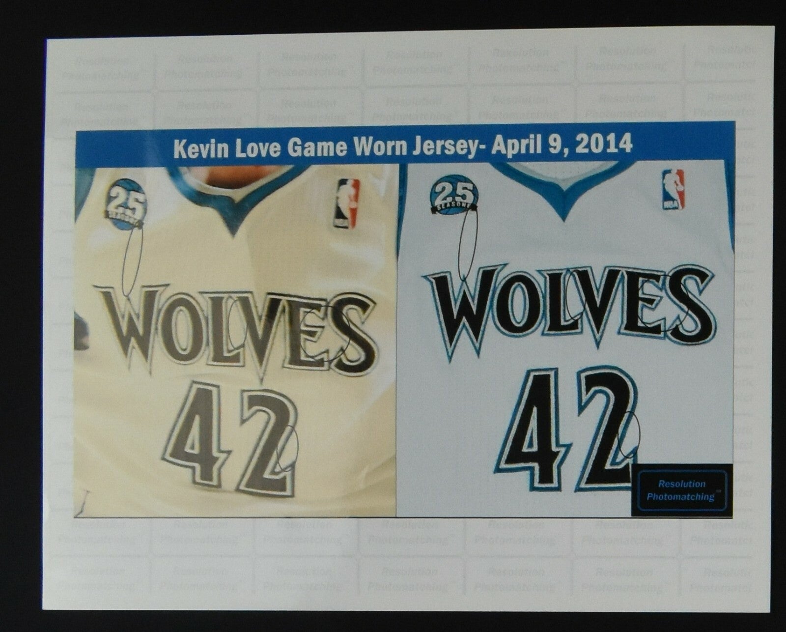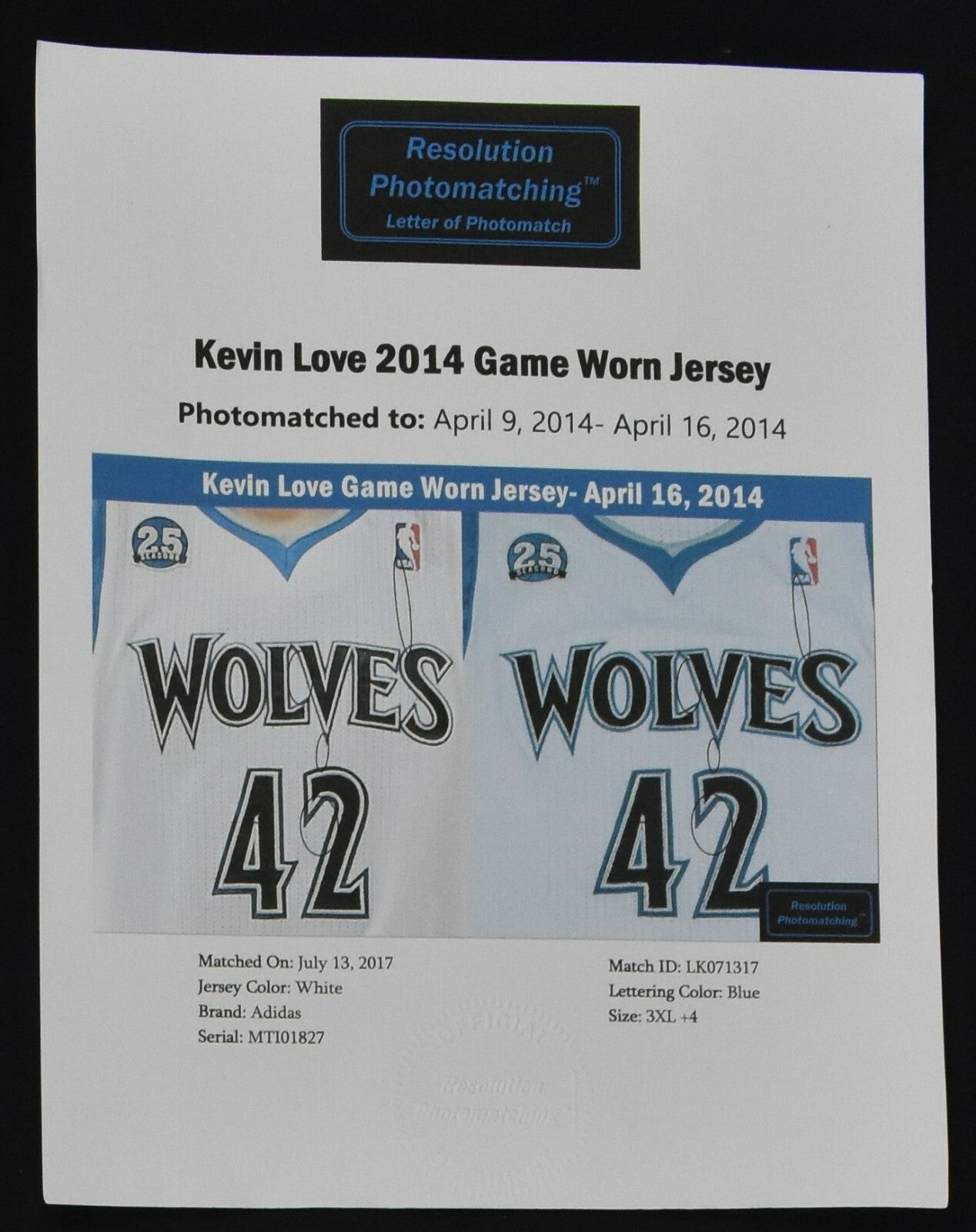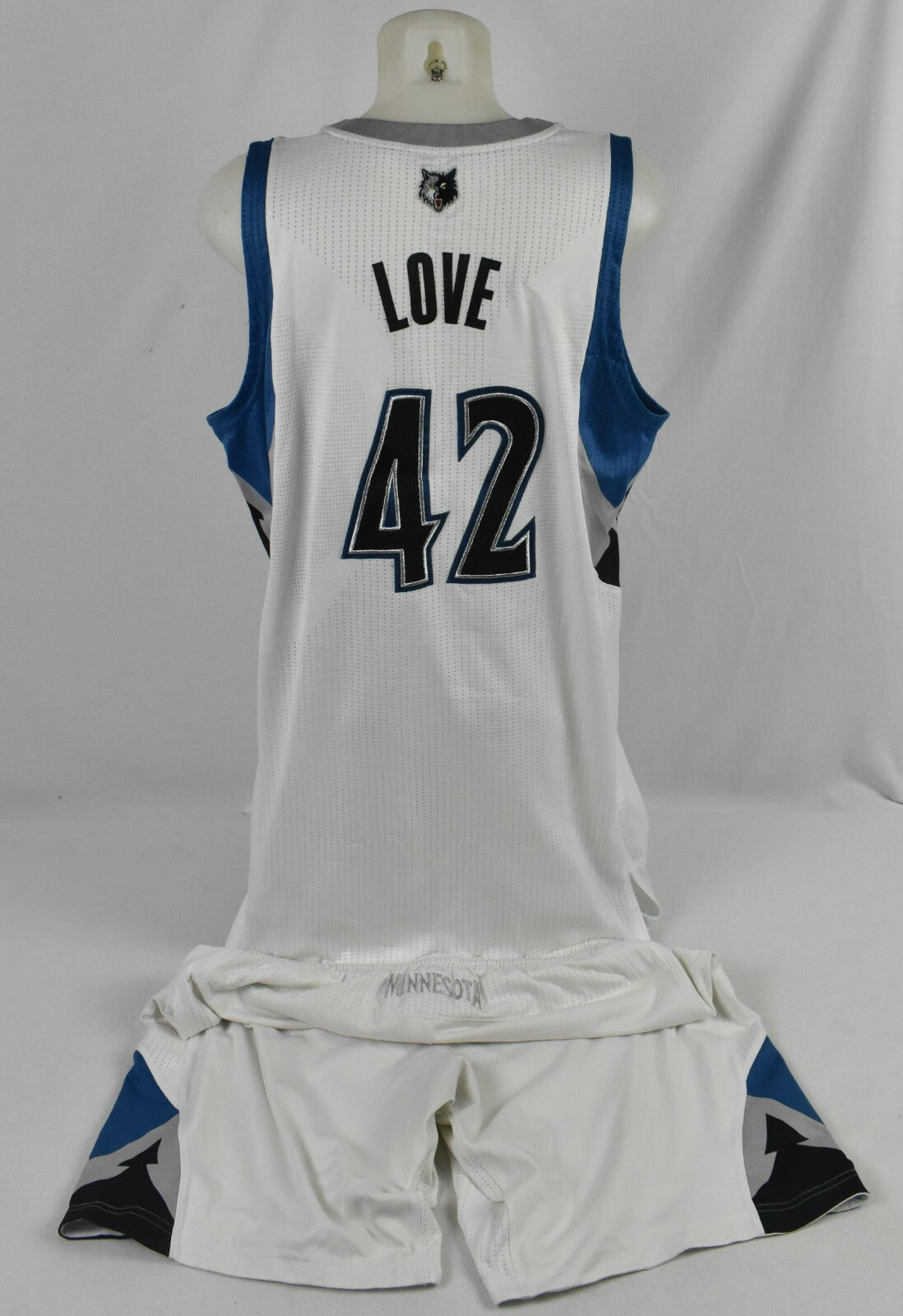 Kevin Love 2014 Minnesota Timberwolves game used and photomatched Uniform from the last game that he played with the Wolves on April 16th, 2014 against the Utah Jazz. This jersey was also matched to a game in which Love played on April 9th, 2015 against the Chicago Bulls. Love is a 5 time NBA All-Star. Accompanied a Letter of Authenticity from Resolution Photomatching detailing each game in which this jersey was matched to. Also includes the shorts worn for each game. Nice Timberwolves uniform from one the franchise's best players.