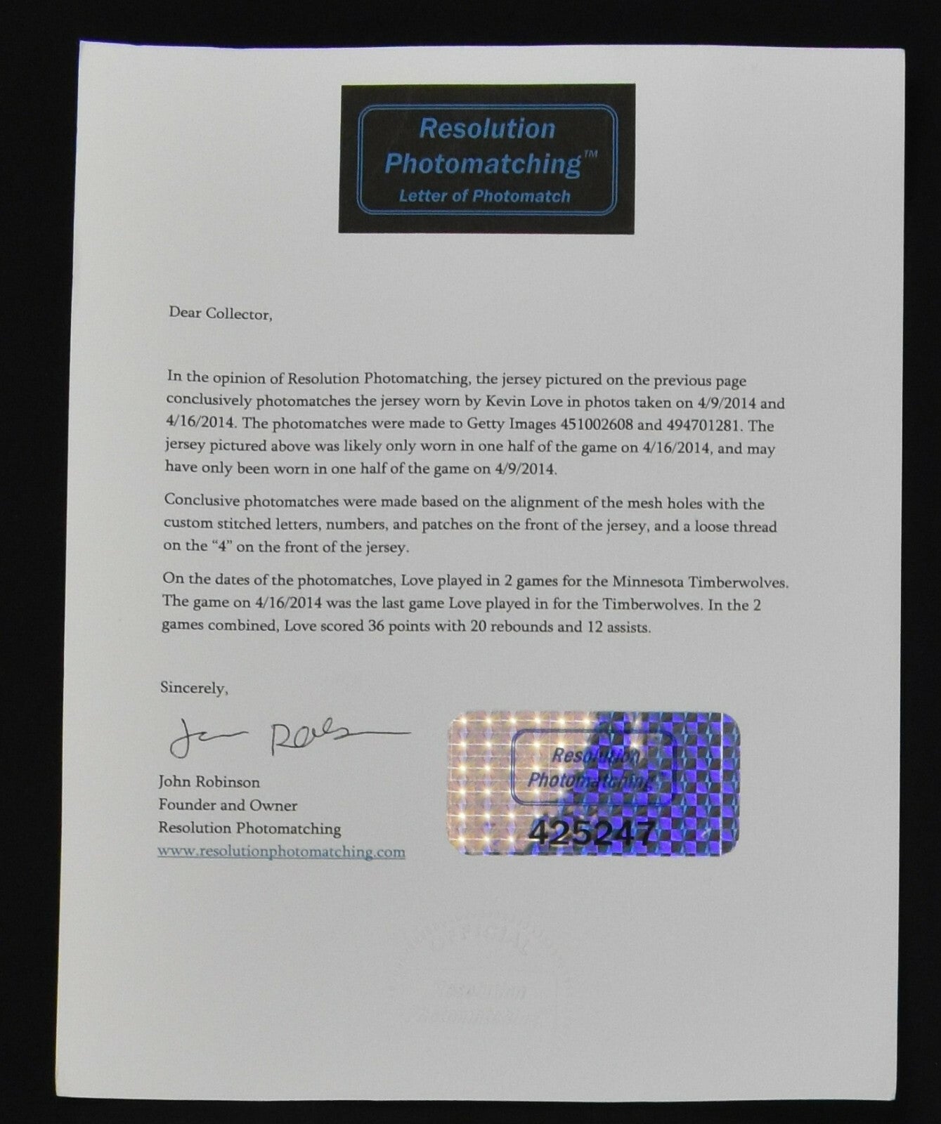 Comes with full photo match COA from Resolution Photo matching.