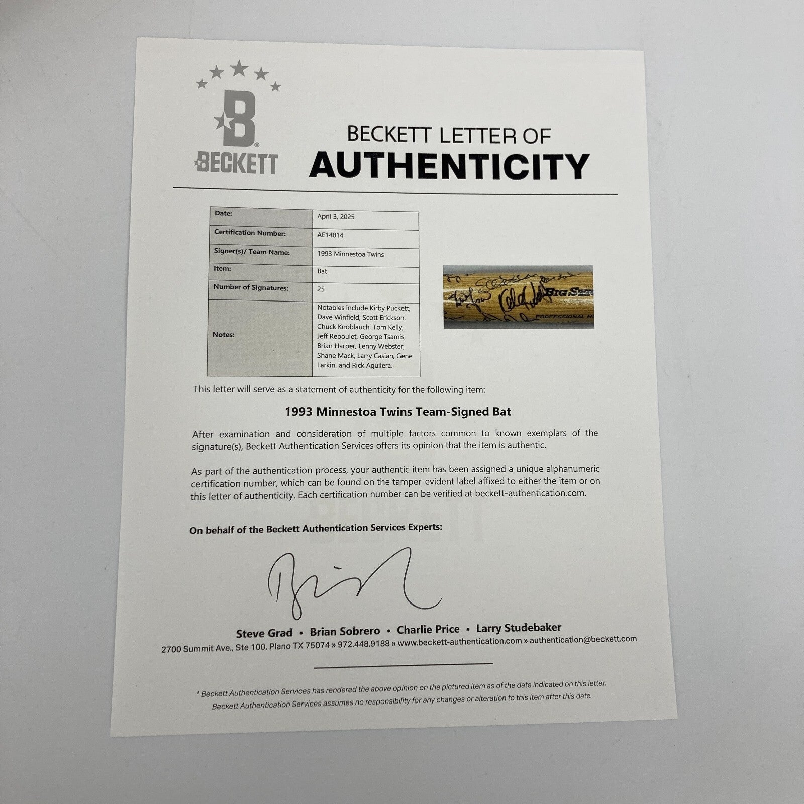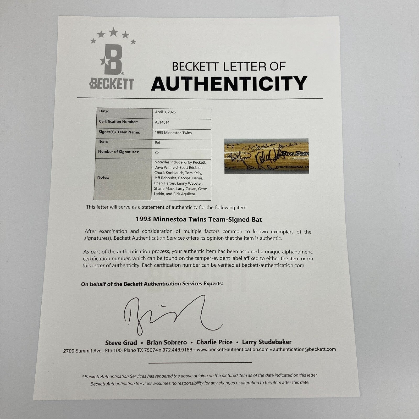1993 Minnesota Twins team signed blonde Rawlings bat with 25 signatures including Kirby Puckett, Dave Winfield, Scott Erickson, Chuck Knoblauch, Tom Kelly, Jeff Reboulet, George Tsamis, Brian Harper, Lenny Webster, Shane Mack, Larry Casian, Gene Larkin, and Rick Aguilera. Accompanied by a Beckett Letter of Authenticity.