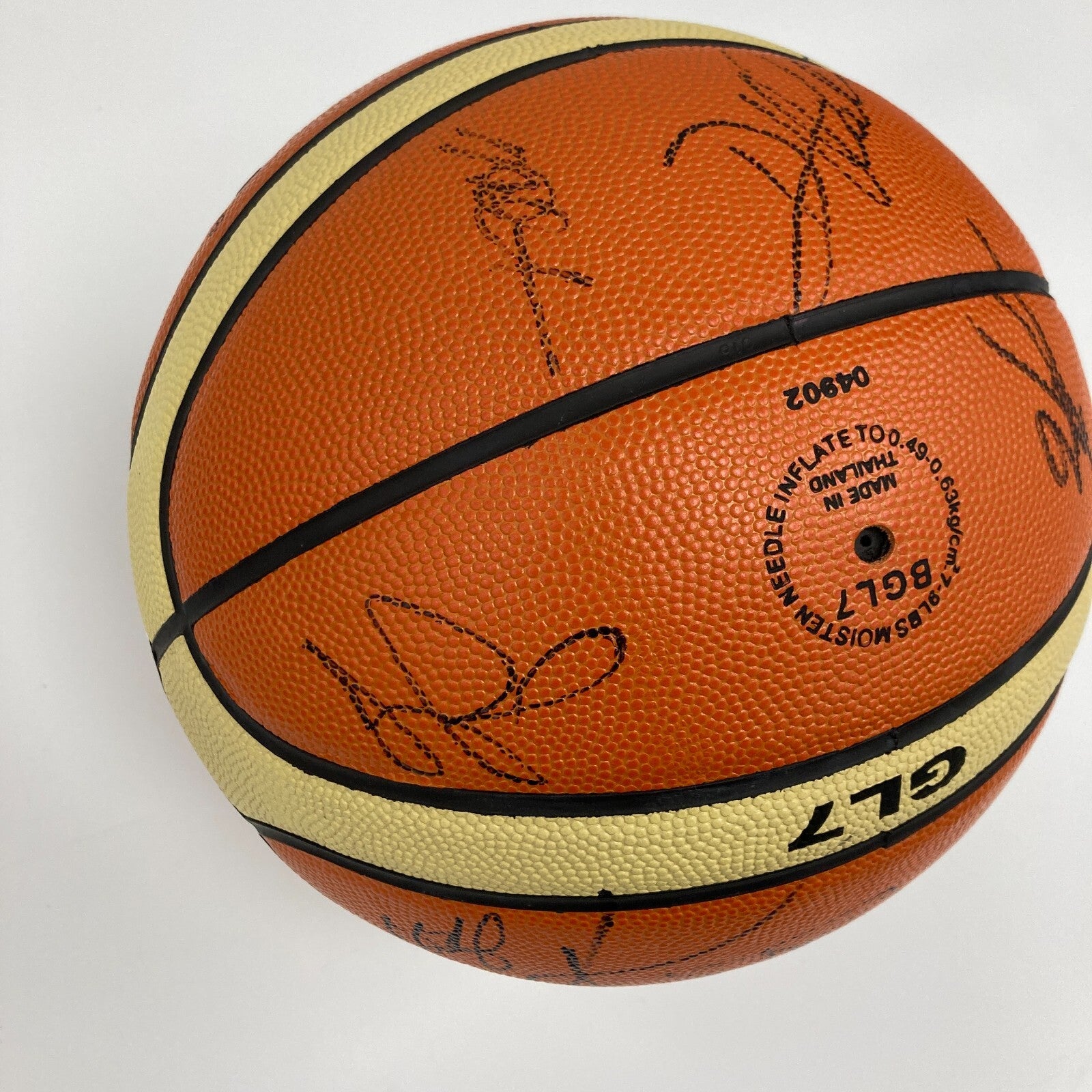 2007 FIBA AmeriCup USA Gold Medal team-signed basketball has 16 autographs from that talented squad. Molten FIBA official ball carries autographs from: Kobe Bryant, Jason Kidd, Chauncey Billups, Deron Williams, Michael Redd, Tayshaun Prince, Dwight Howard, Amar'e Stoudemire, Mike Miller, Tyson Chandler, Coach K, Jim Boeheim, two coaches, and one other; the only missing players are LeBron James and Carmelo Anthony. As expected with such exceptional talent on the roster as well as the bench, Team USA romped through the field before recording a 91-76 victory over Argentina in the final game to claim the top podium position.