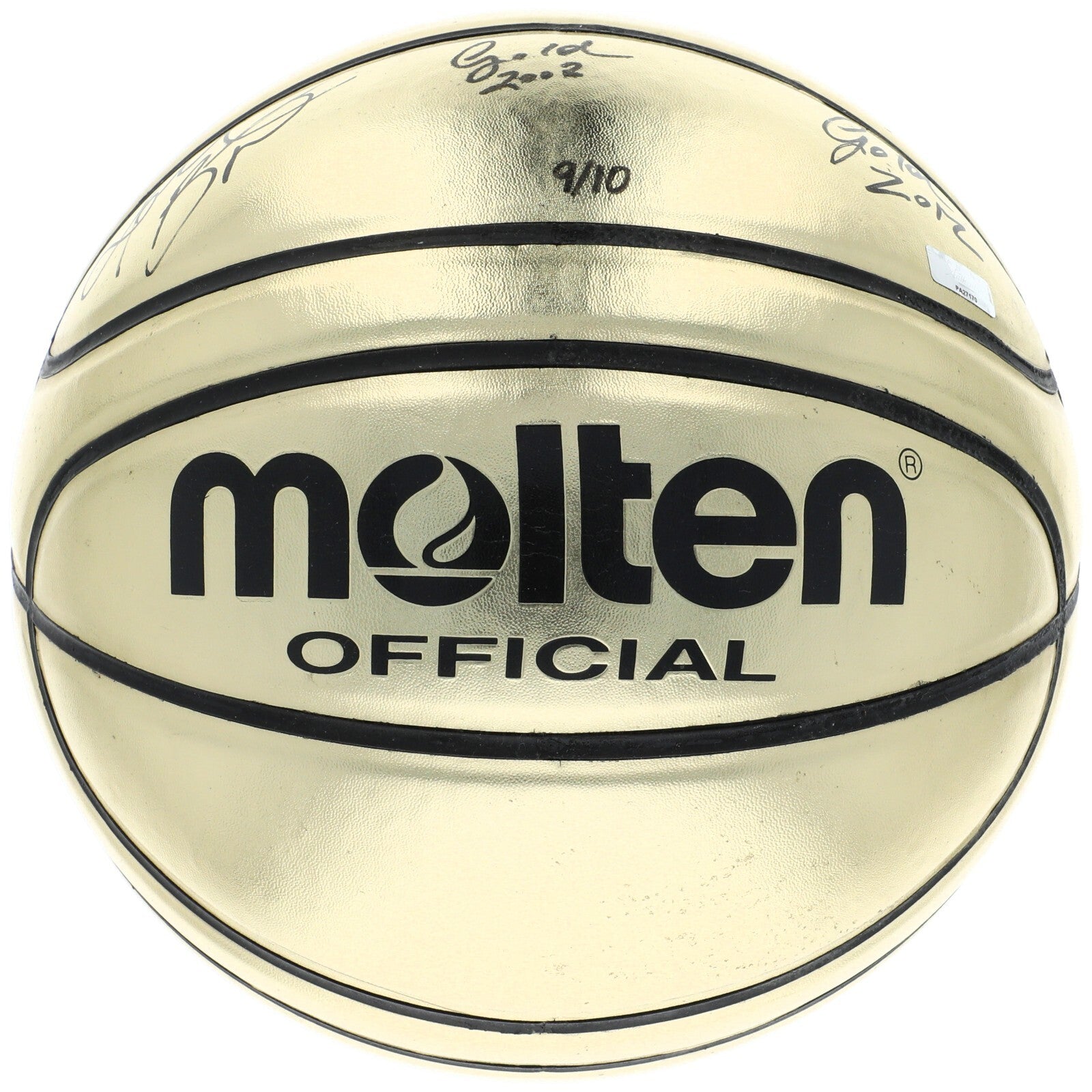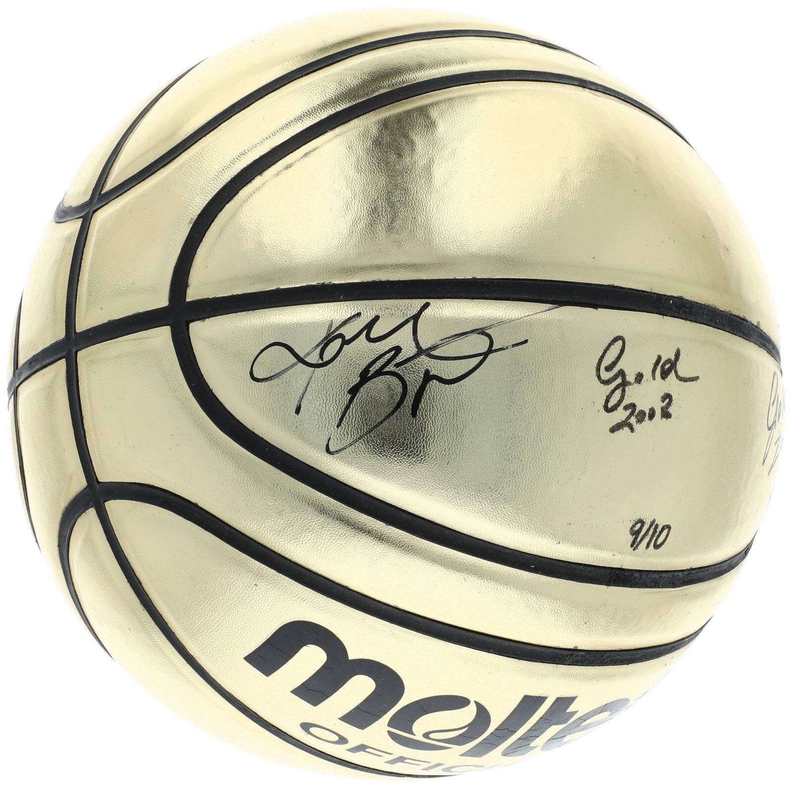 Hall of Famer Kobe Bryant has signed this gold, limited-edition (#9/10) Molten Official basketball. Bryant played his entire 20-year career with the Lakers, entering the NBA directly from Lower Merion High School. He won five NBA Championships during his career and was an 18-time NBA All-Star. He led the NBA in scoring during two seasons, ranks third on the league's all-time regular season scoring, and fourth on the all-time post-season scoring list. Bryant also earned two gold medals with the US Men's Olympic team in 2008 and 2012.