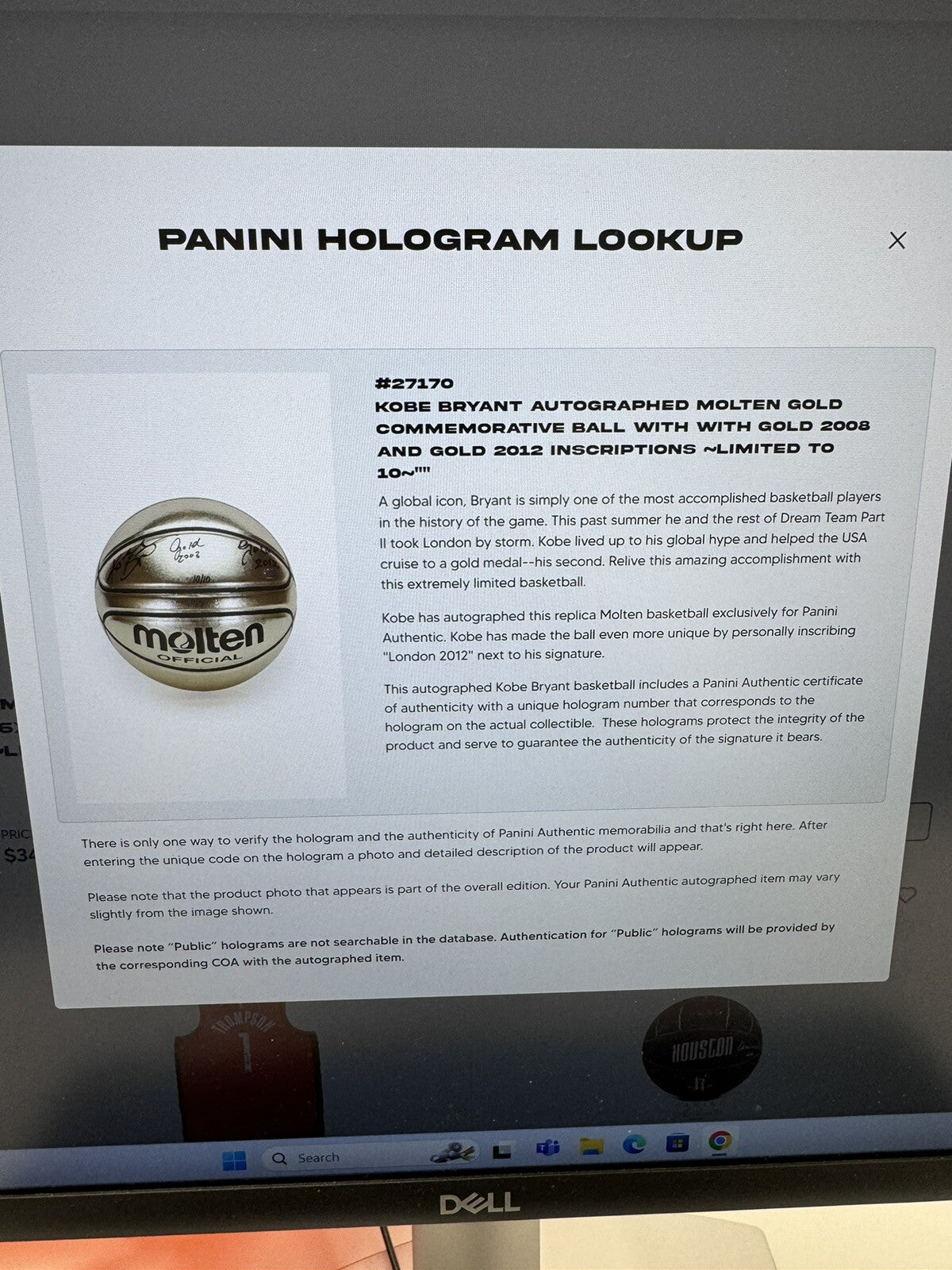 The presented basketball is gold and features "MOLTEN OFFICIAL" imprinted in black. Bryant inscribed "Gold 2008" and "Gold 2012" next to his flowing signature in black ink. The ball comes with a COA from Panini (PA27170) for Bryant's signature and original Panini Box.
