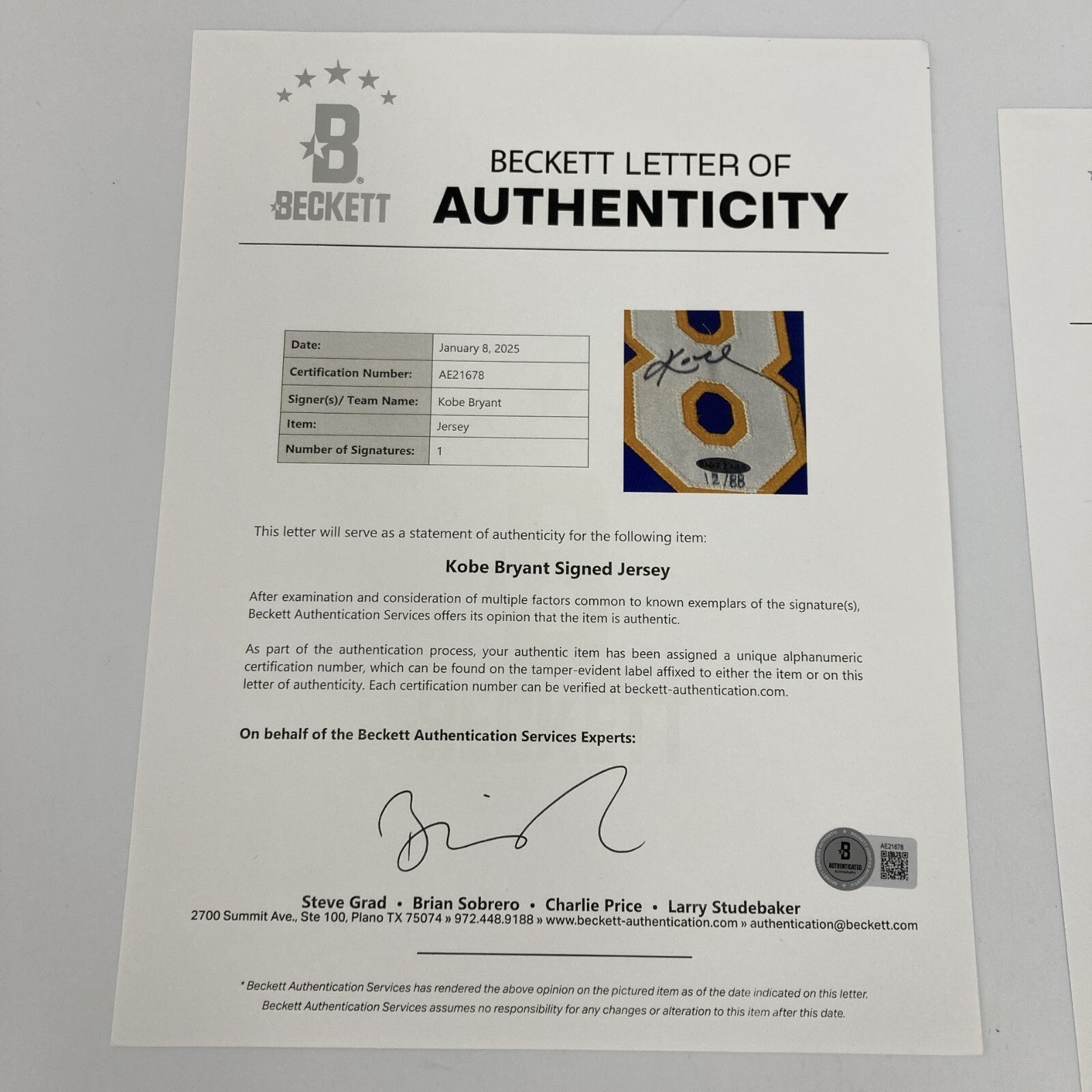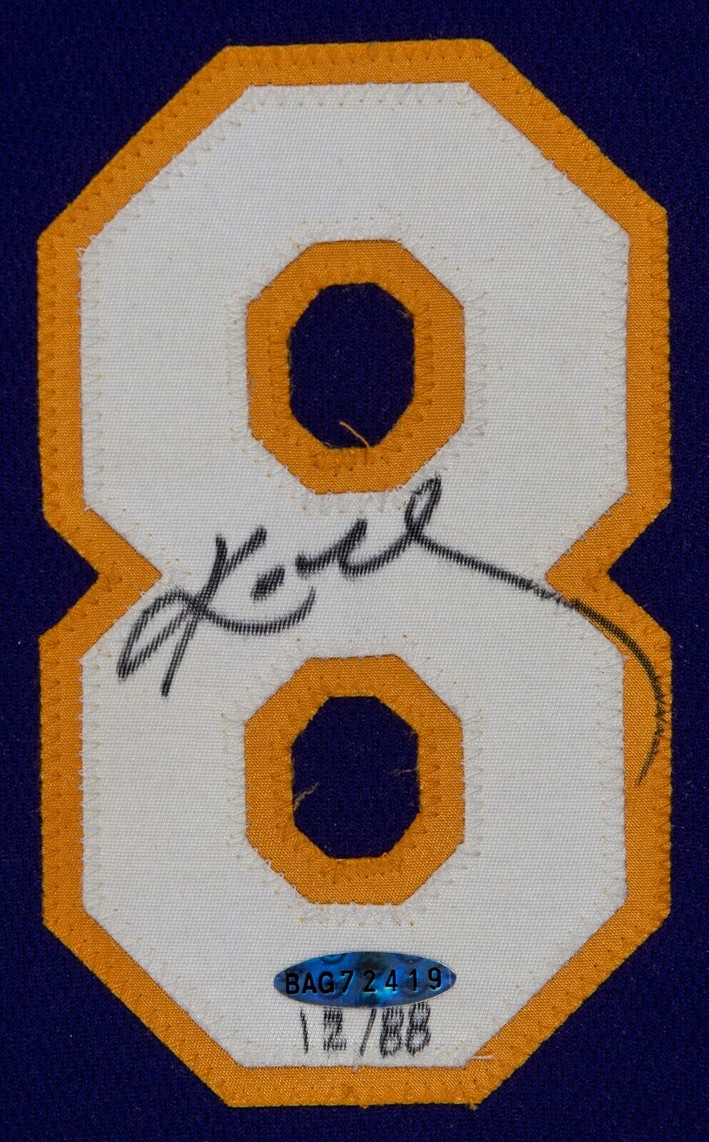 The Nike jerseys are size 46 and rest inside a 66-by-44-inch frame that features purple and gold trim. Going left to right, the first jersey features a "Kobe #8 2000 Champions" patch on the right shoulder. Bryant signed the number "8" on the front of the limited edition (#12/88) jersey.