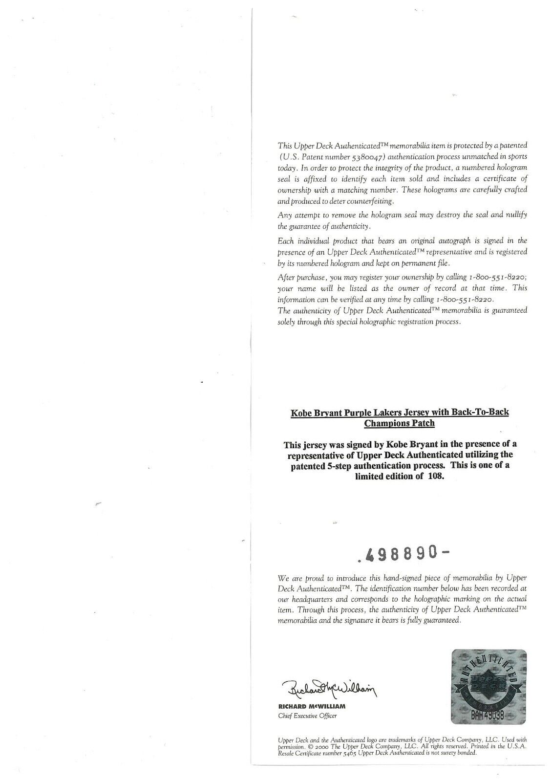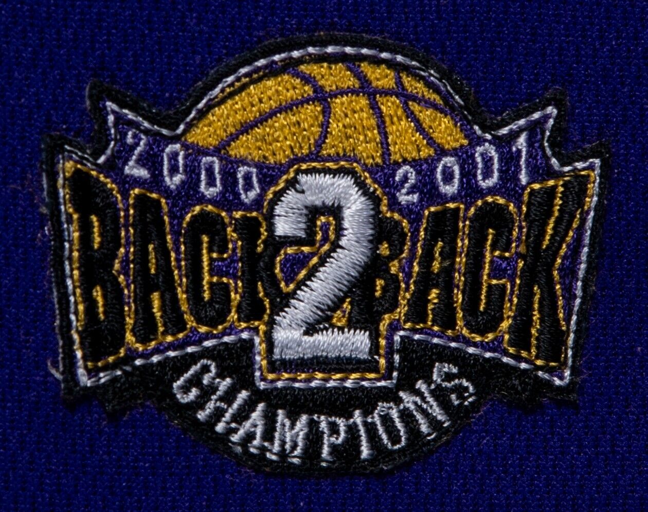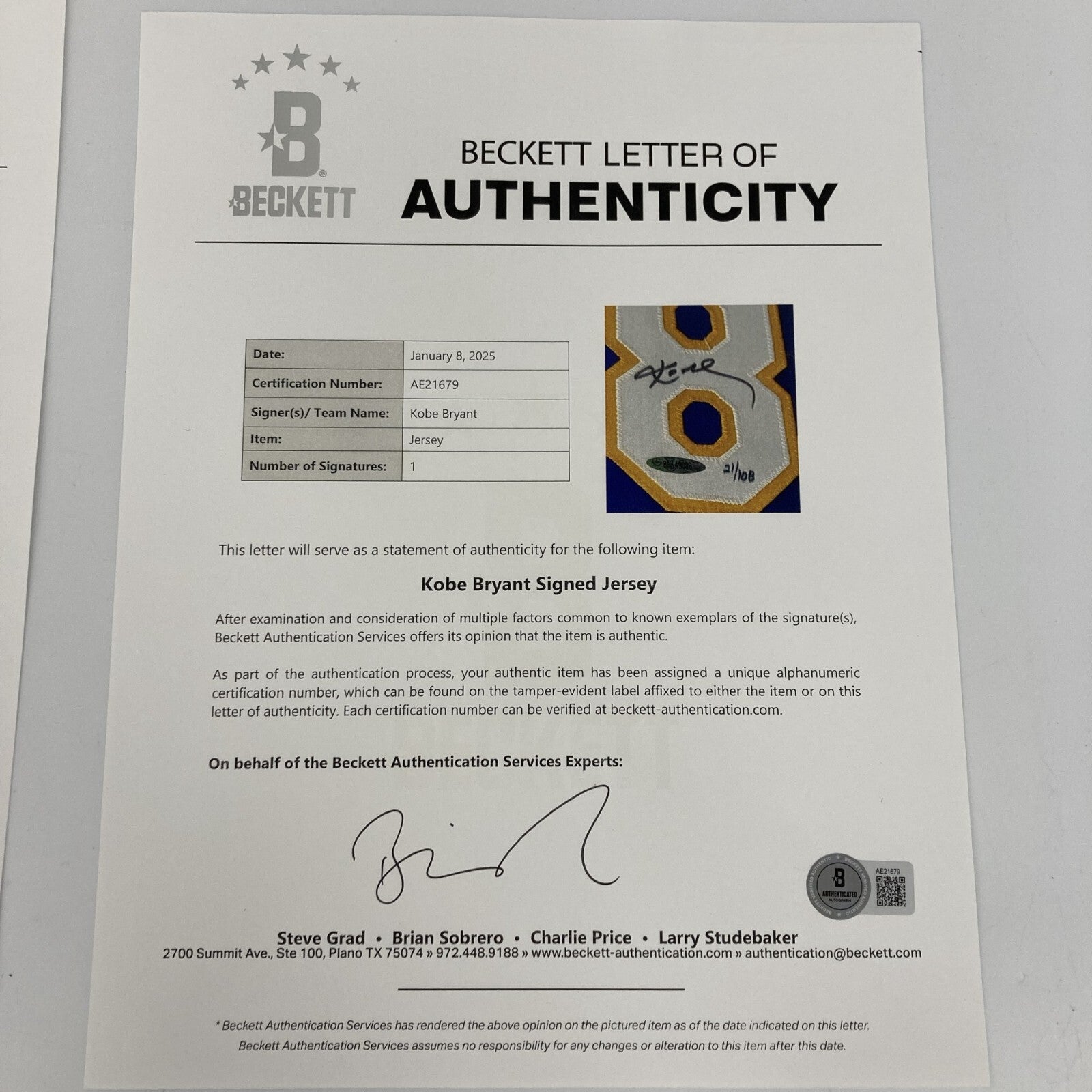 The middle jersey features a "2000-2001 Back 2 Back Champions" patch on the right shoulder. Bryant placed his flowing black marker signature across the number "8" on the limited edition (#21/108) jersey.