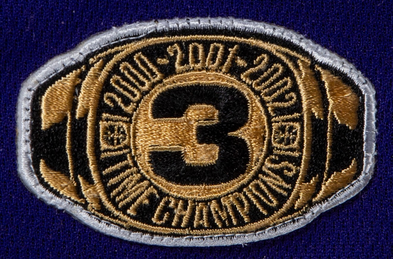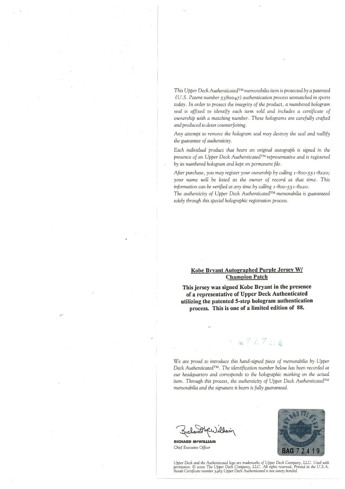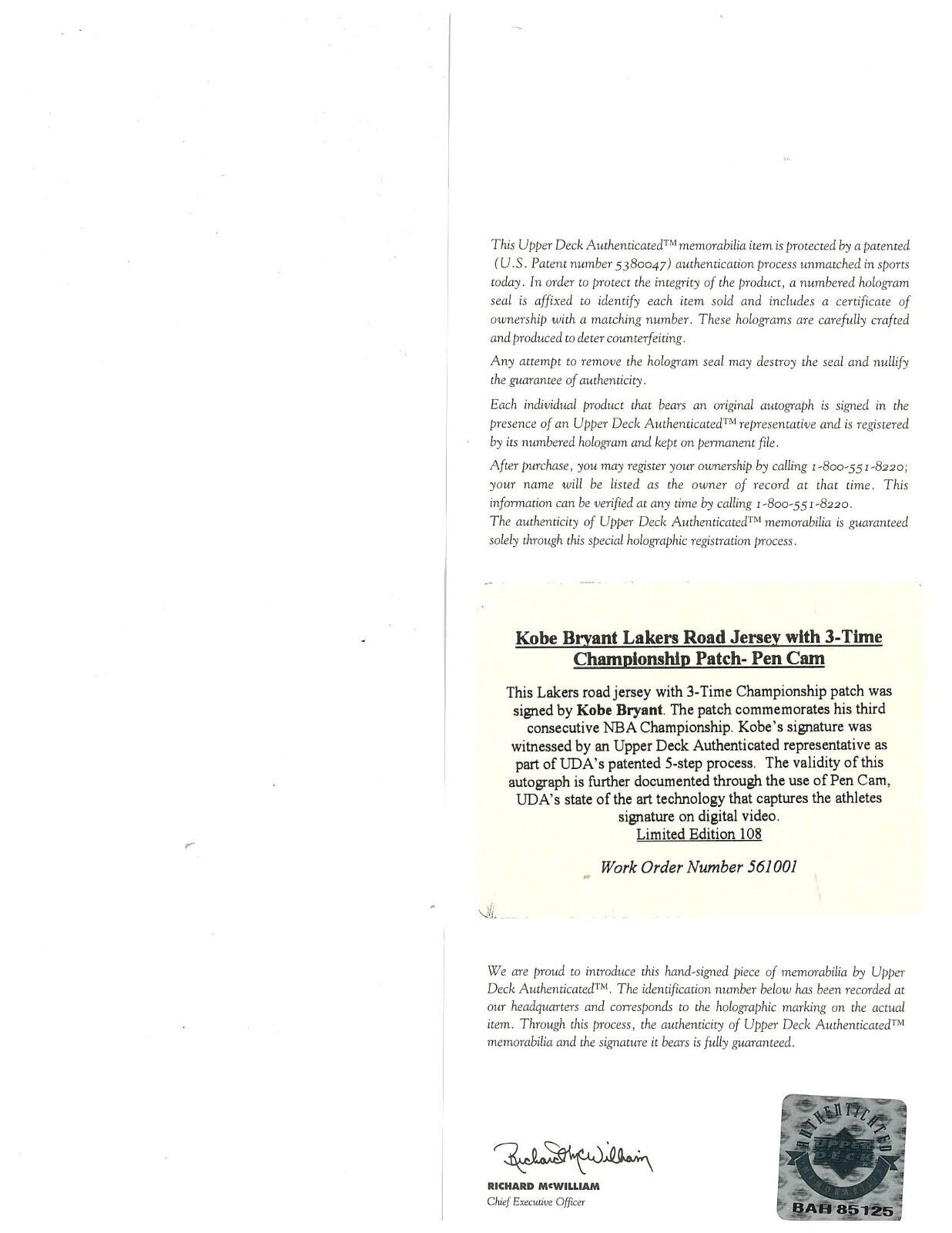 The middle jersey features a "2000-2001 Back 2 Back Champions" patch on the right shoulder. Bryant placed his flowing black marker signature across the number "8" on the limited edition (#21/108) jersey.