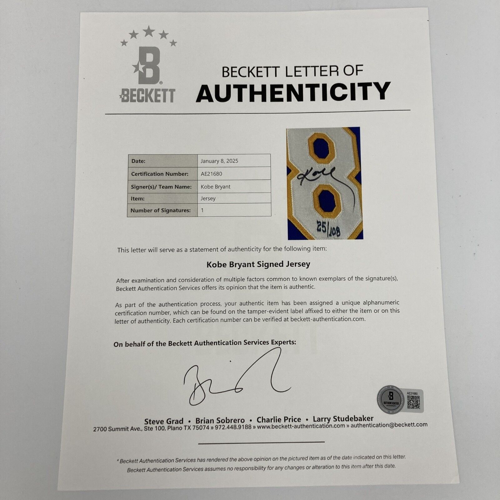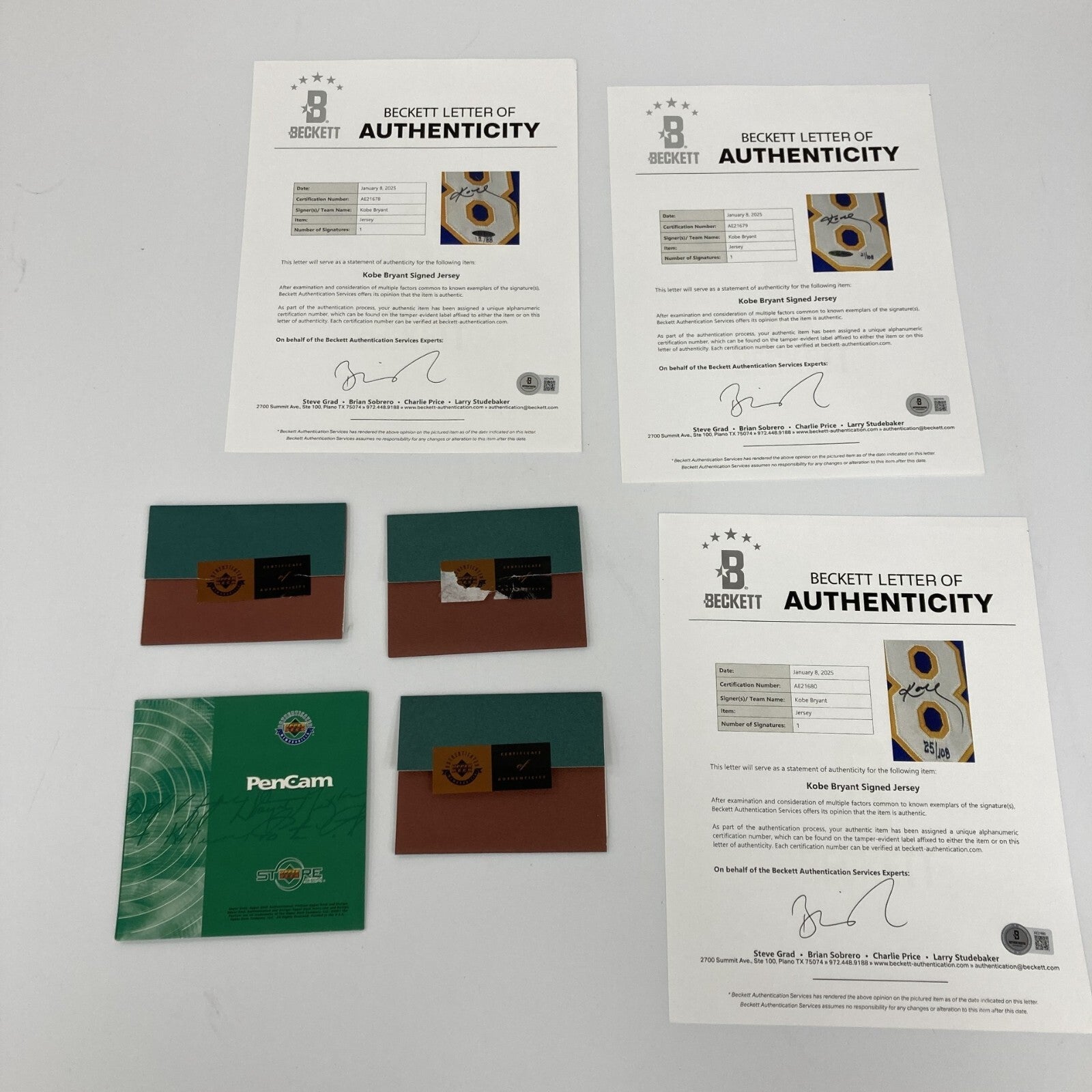 The final jersey features a "2000-2001-2002 3 Time Champions" patch on the right shoulder, with Bryant placing a black marker signature across the number "8" on the limited edition (#25/108) jersey. Each jersey is accompanied by a COA from UDA and LOAs from Beckett for Bryant's signature. There is slight damage to the bottom of the frame. See photos.