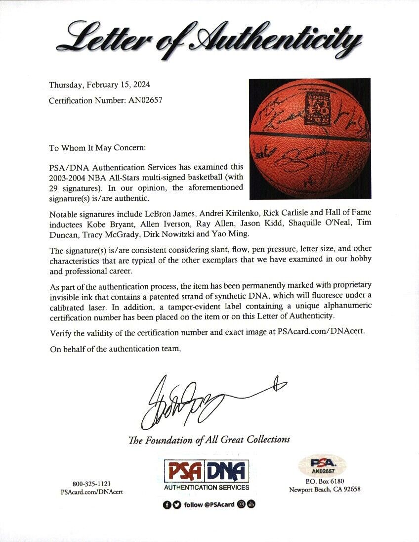 2004 Official NBA (Stern) basketball is jammed with 31 autographs from that season's All-Star squads. Black Sharpie signatures include: LeBron James (Rookie season), Kobe Bryant, Shaquille O'Neal, Tim Duncan, Kevin Garnett, Dirk Nowitzki, Allen Iverson, Jason Kidd, Ray Allen, Tracy McGrady, Yao Ming, Vince Carter, Ben Wallace, Brad Miller, Sam Cassell, Baron Davis, Kenyon Martin, Andrei Kirilenko, Rick Carlisle (coach), Flip Saunders (coach), and more. Stamp reading "NBA All-Star 04 LA 2004 Los Angeles" is on the panel above the main Spalding logo.Comes with PSA DNA LOA.