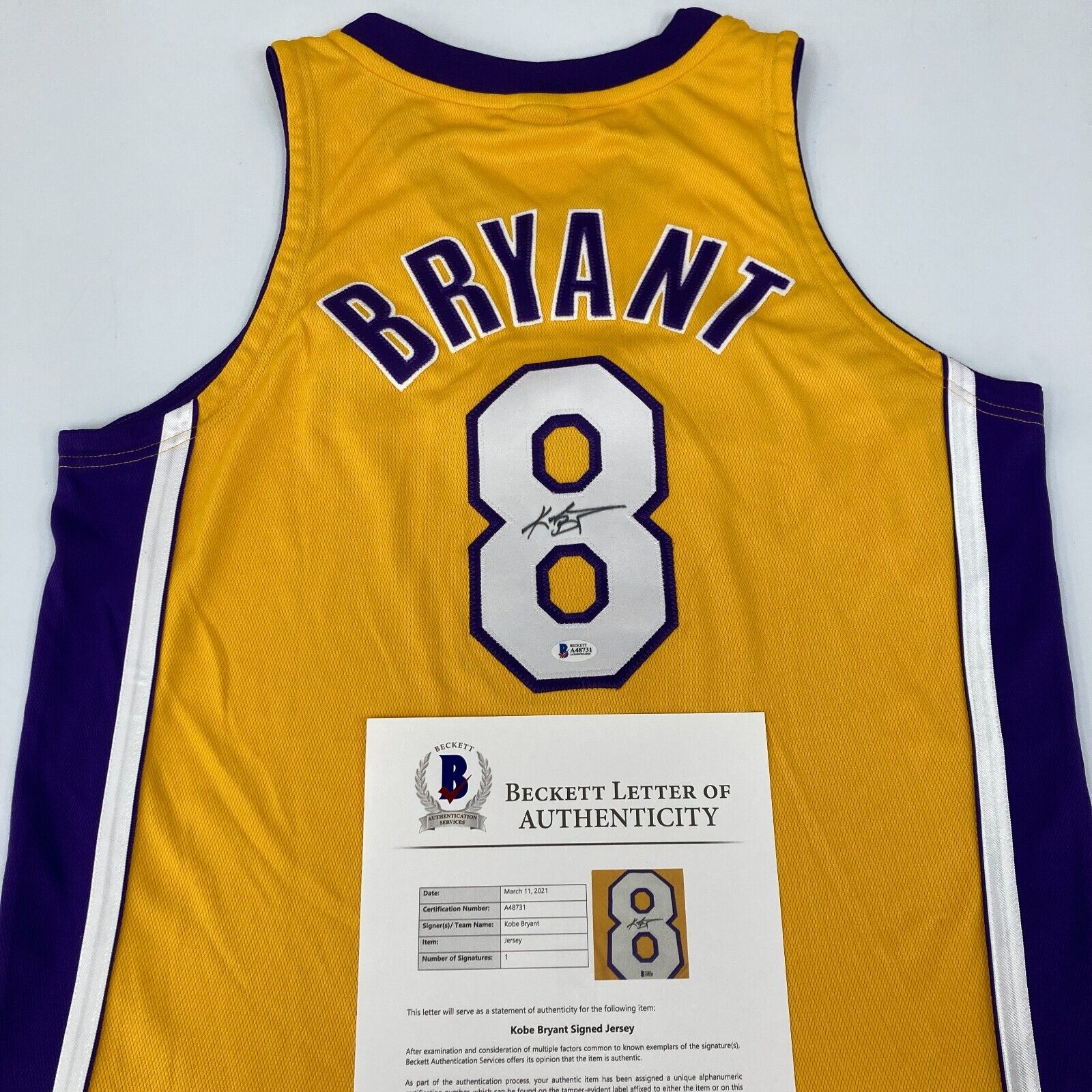 Rare Kobe Bryant Signed 1999-2000 NBA Finals Los Angeles Lakers Authentic Pro Cut Game Model Nike Jersey. Comes with full letter COA and sticker from Beckett and a PSA DNA Sticker and COA. PSA witnessed Kobe signing this jersey on June 22, 2001.