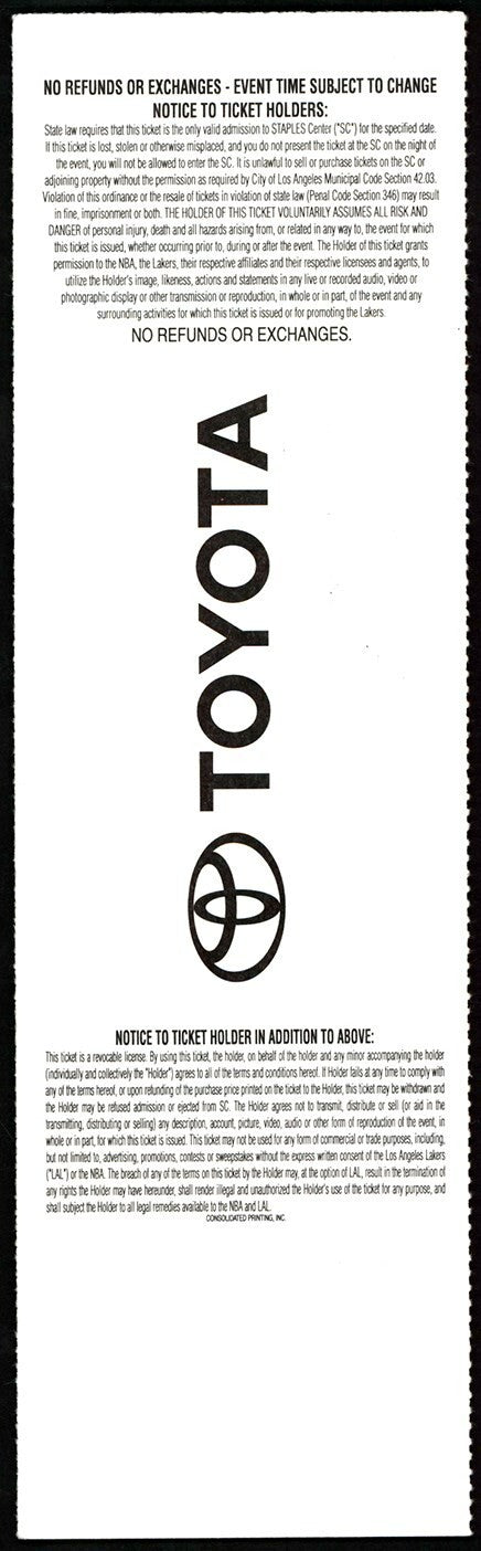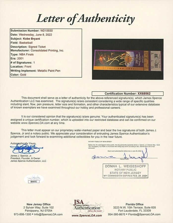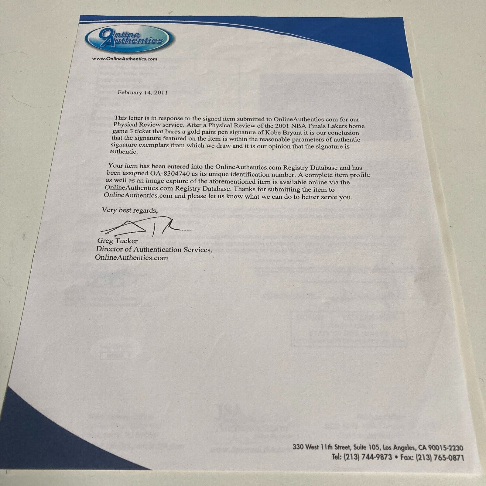 Los Angeles Lakers full ticket issued for Game 6 of the 2001 NBA Finals signed by Kobe Bryant on the front. Bryant has flawlessly scripted his name in gold paint, with the signature grading 10/10. A ticket such as this is commonly referred to in the hobby as a "phantom" because Game 6 (which would have been the third game in Los Angeles) was never played. After splitting the first two games at home, the Lakers swept the Philadelphia 76ers in Philadelphia to win their second consecutive World Championship. The ticket (2.25x7.75") remains in Excellent to Mint condition. Accompanied by a COA and corresponding hologram label (affixed to the front base of the ticket) from Online Authentics.
