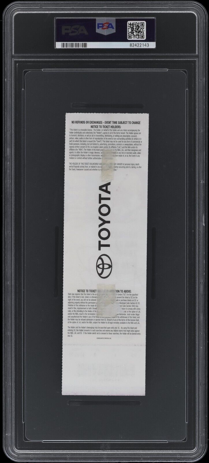 Presented is a full ticket from the Jan. 22, 2006, game that saw Kobe Bryant deliver one of the most impressive individual performances in NBA history by scoring 81 points against the Toronto Raptors. The Lakers shooting guard's total was second only to the unthinkable 100 points put up by Wilt Chamberlain decades earlier. Bryant shot 28-of-46 from the floor, with an additional 18 points coming from the charity stripe. Bryant's heroics pushed the Lakers to a 122-104 victory in a season where wins were hard to come by for the team. Helped by a scoring output of this magnitude, Bryant led the NBA in scoring during the 2006-07 season with a healthy 31.6 points per game. Bryant's flowing signature in black marker appears across the ticket's front, creating a poignant memento from one of the most impressive games in NBA history.