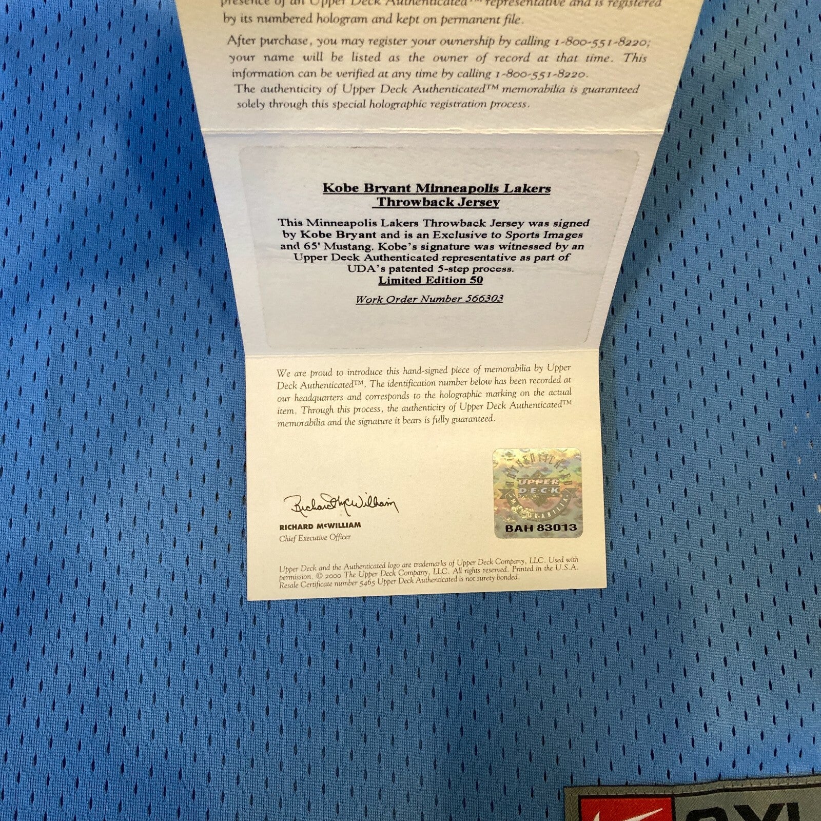 Kobe Bryant Signed Autographed Los Angeles Lakers M.P.L.S. Authentic Nike Throwback Jersey. This jersey originated from UDA Upper Deck and has a UDA COA but the hologram fell off. Also comes with JSA COA and hologram.