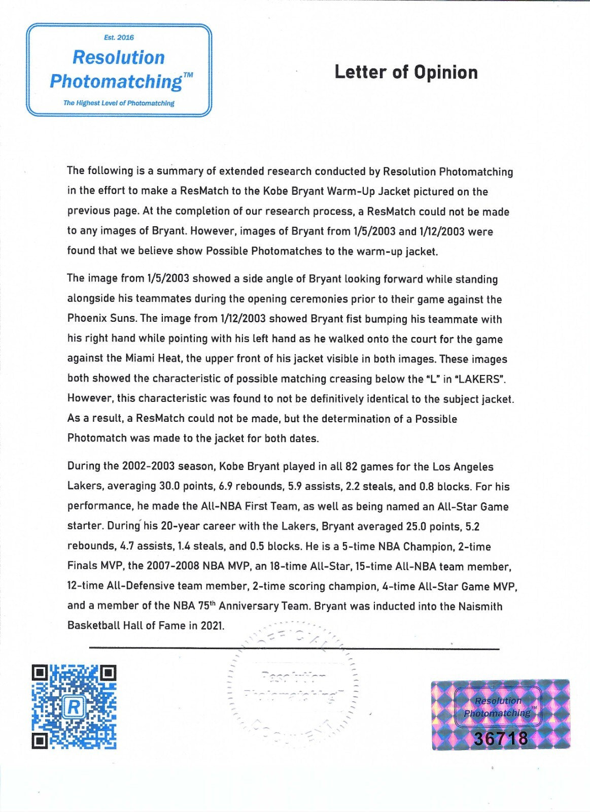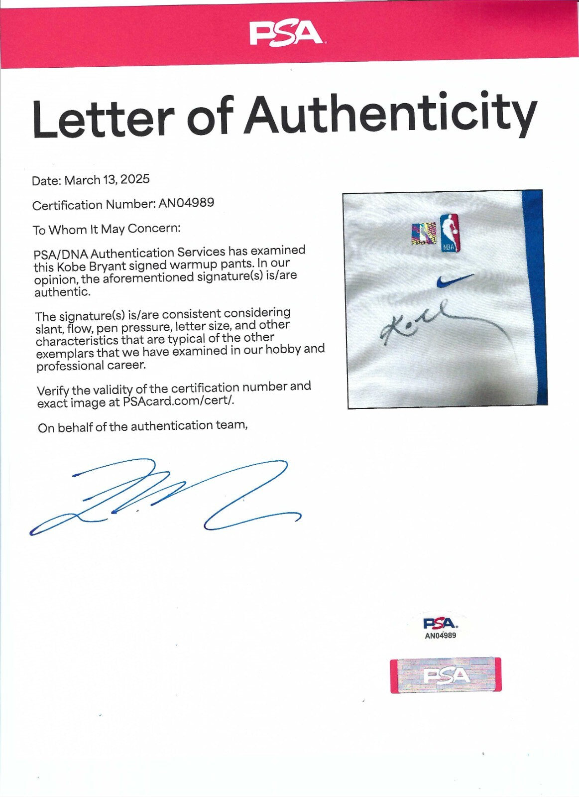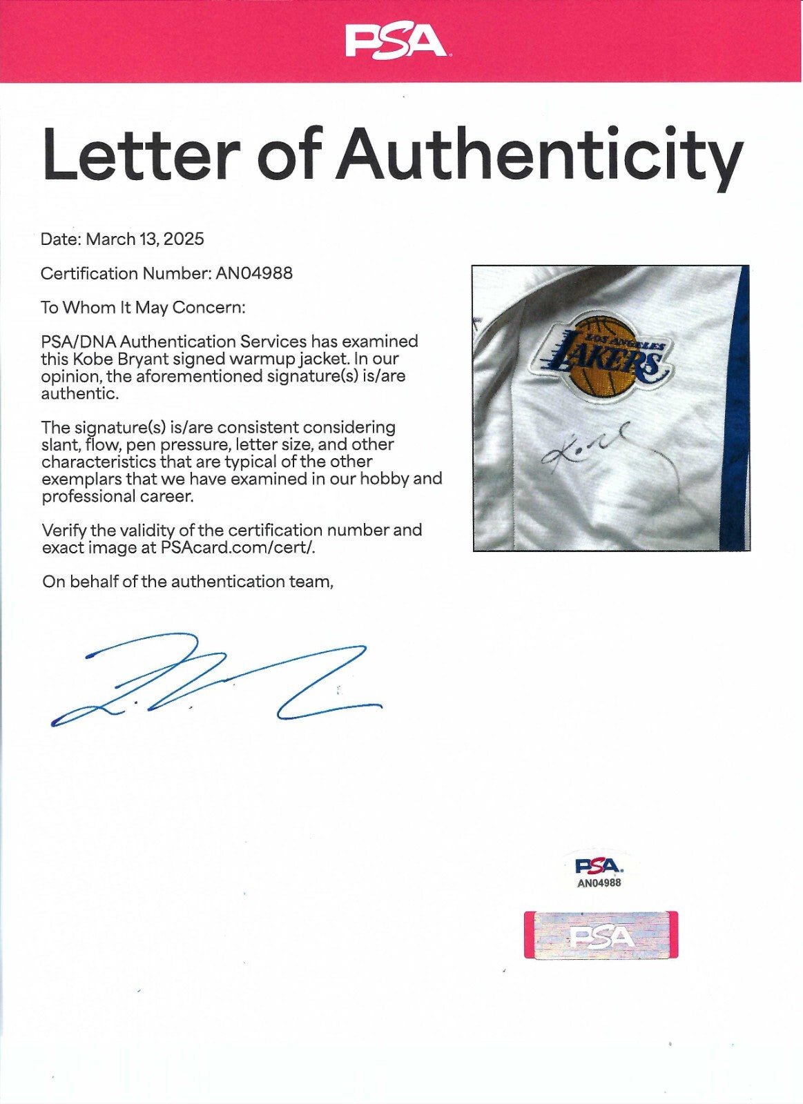 Includes full LOAs from JSA and PSA/DNA for the two Kobe autographs; a letter from the Los Angeles Lakers on team letterhead; and a letter of opinion from Resolution Photomatching.