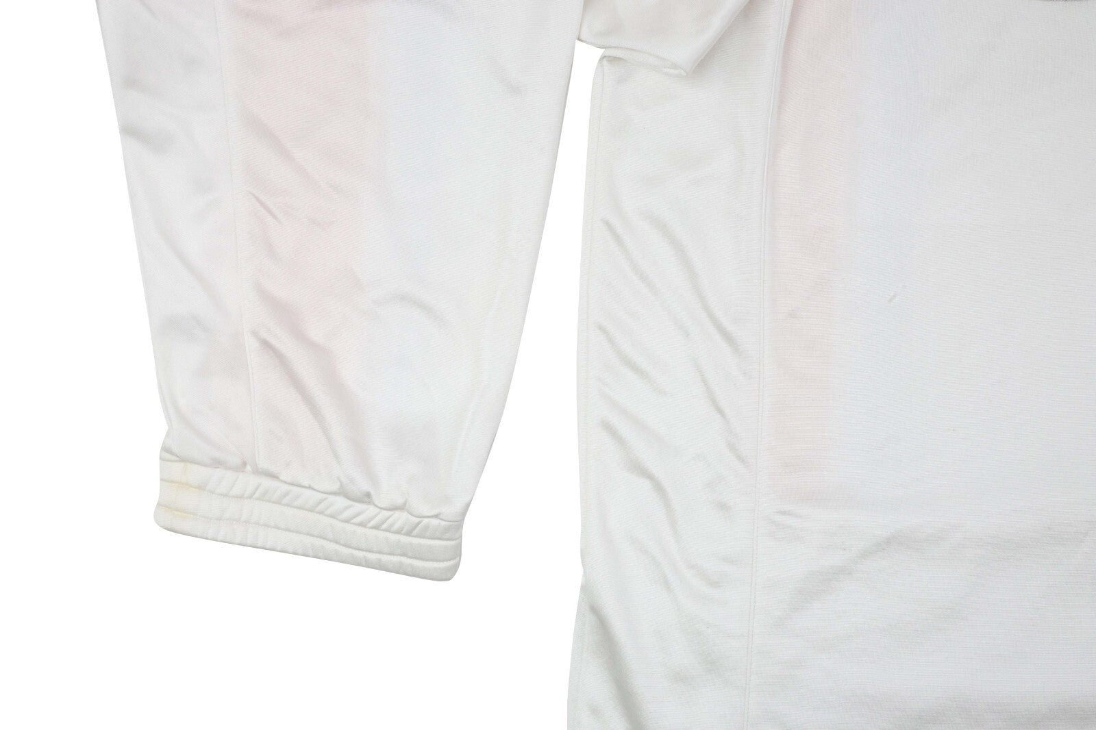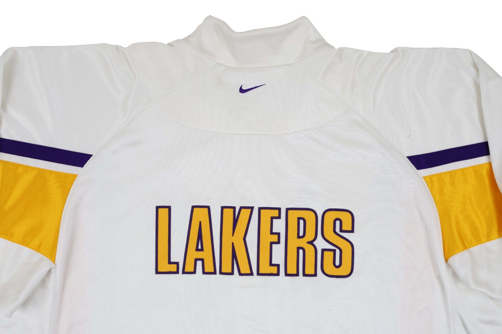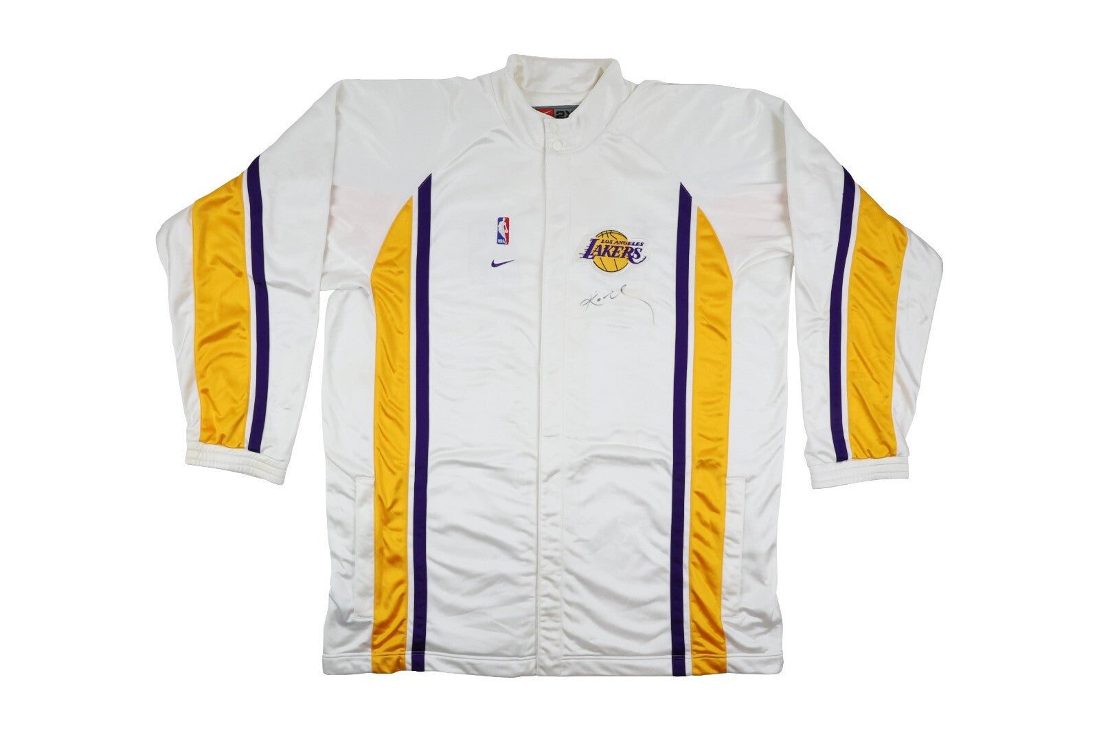 The white button-up jacket has NBA and Nike logos on the right chest, with the Lakers logo patch sewn on the left chest and Kobe’s signature in black marker just below it. Purple and yellow gold stripes run down the sides of the torso as well as the sleeves. The reverse has “LAKERS” in large gold block letters across the back. Within the collar is proper Lakers/Nike/NBA tagging in Kobe’s size 2XL with a Length +4 hang tag. Inside the left tail inseam are the laundry instructions and “2002-03” year tag. The jacket exhibits heavy pilling on the knit fabric from repeated wear and shows evidence of being washed multiple times.