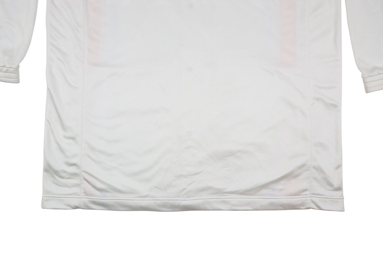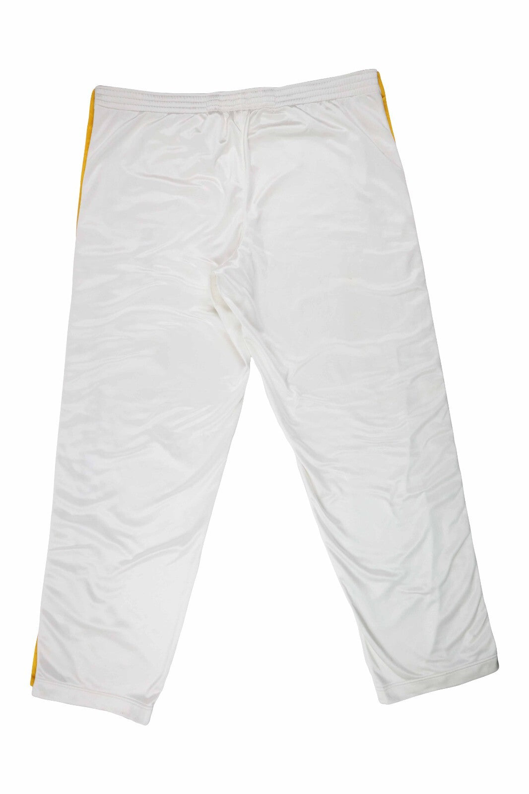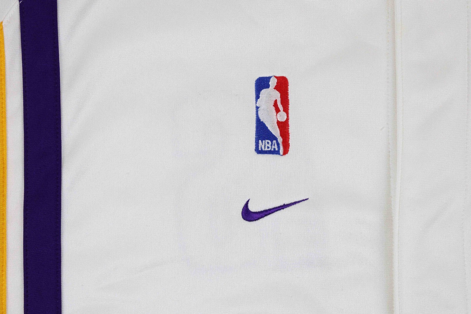 The accompanying white pants have matching purple and gold stripes down the sides, with NBA and Nike logos sewn on the left thigh and Kobe’s black marker signature just below. On the lower left leg is a Lakers logo patch and “Los Angeles” stitched in purple. Interior tagging indicates size 2XL with a Length +4 hang tag, but the pants appear to have stretched significantly. Baggy was the fashion trend back in the early 2000’s, so perhaps this was how Kobe liked to wear them.