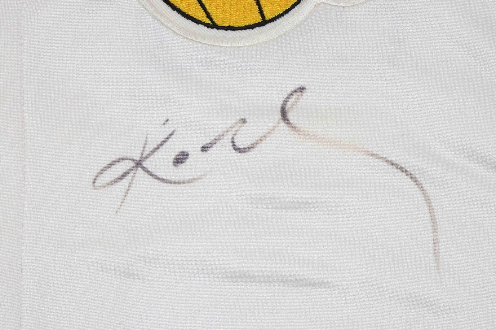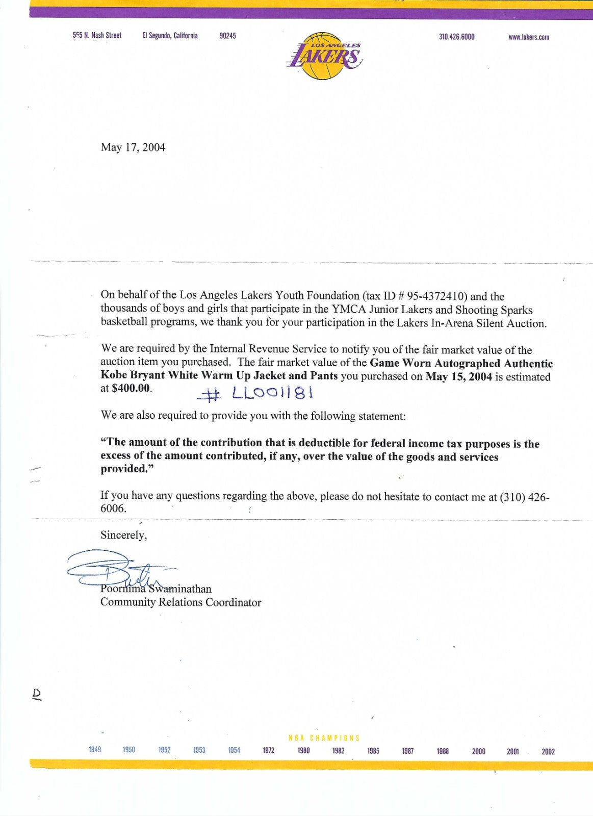 Offered here is Kobe’s 2002-03 game worn warm-up suit with the jacket and pants both autographed by the Black Mamba himself. Kobe and his Laker teammates wore this Nike all-white style into the 2003-04 season as well. It was sourced directly from the L.A. Lakers Foundation and comes with a May 2004 team letter. Photographic evidence from Resolution Photomatching shows what appears to be possible matches to two January 2003 home games: a 1/5 win vs. Phoenix (31 points, 12 boards & 7 dimes); and a 1/12 win vs. Miami (36 pts. & 4 steals). Stock images are sparse when it comes to game footage of players in their warm-ups.