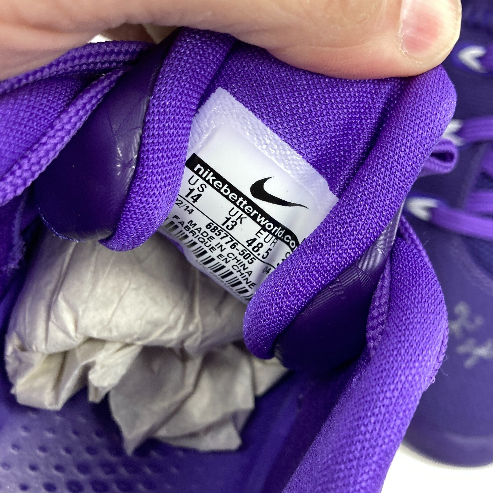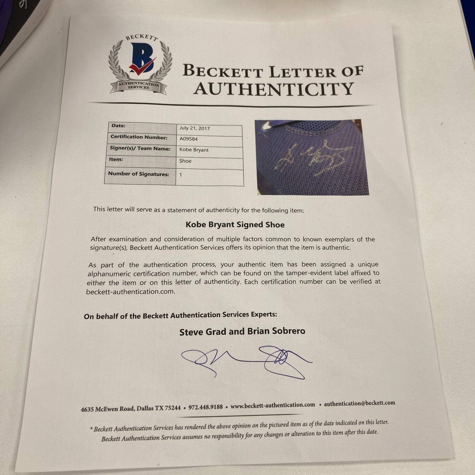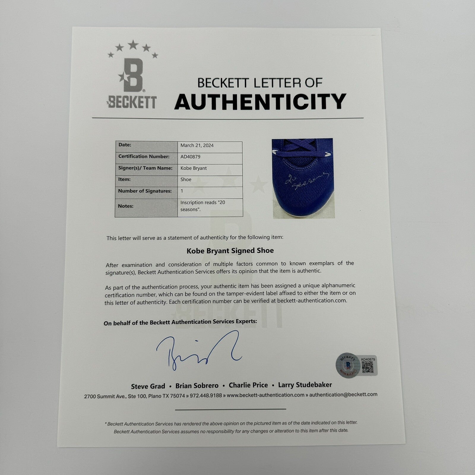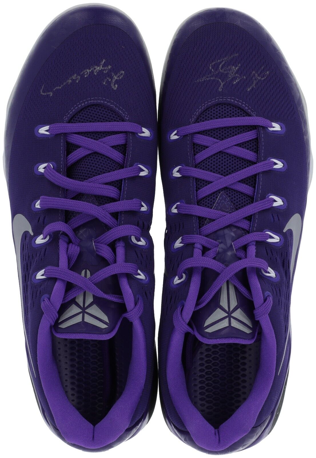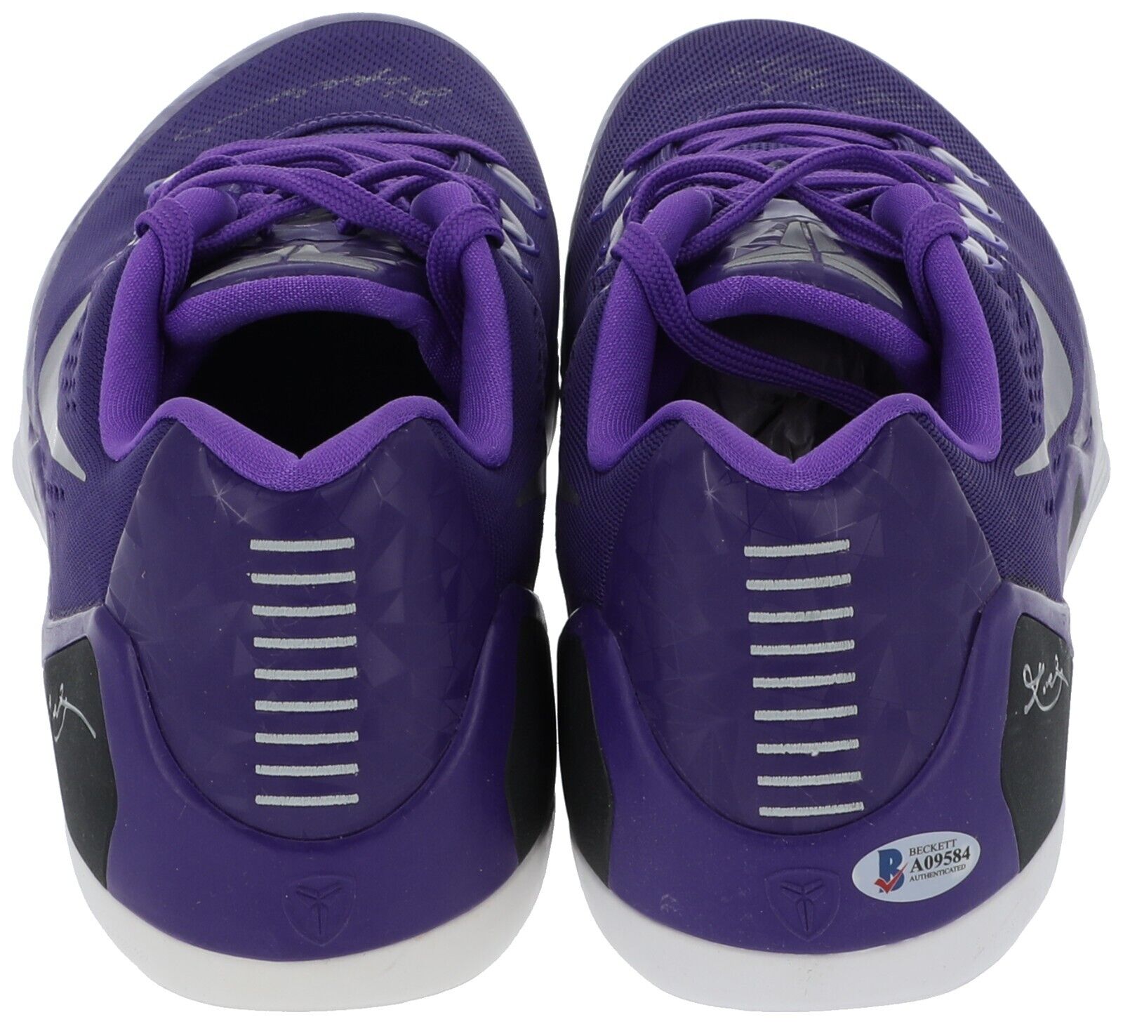 Los Angeles Lakers legend Kobe Bryant has placed his silver ink signature across the toe box of the right shoe from this pair of Nike Kobe IX 9 EM sneakers. Across the toe box of the left shoe, Bryant contributed the silver ink inscription "20 Seasons," a reference to the 20 illustrious campaigns he spent with the Lakers, the most in franchise history. The "Black Mamba" was among the very best players in the NBA for each of those 20 seasons, with 18 All-Star selections proving Bryant's global popularity and his 25.0 points per game scoring average affirming the former Lower Merion High School phenom's talent on the hardwood. A posthumous inductee into the Naismith Memorial Basketball Hall of Fame, the impact of Bryant's loss on the basketball world remains incalculable since his tragic passing at the age of 41 in 2020. The shoes are primarily purple, with silver Nike "Swoosh" emblems on the side and silver "Black Mamba" logos on the tongue. They feature a white sole with black midsole accents. The shoes come with an LOA from Beckett Authentication for the signature.