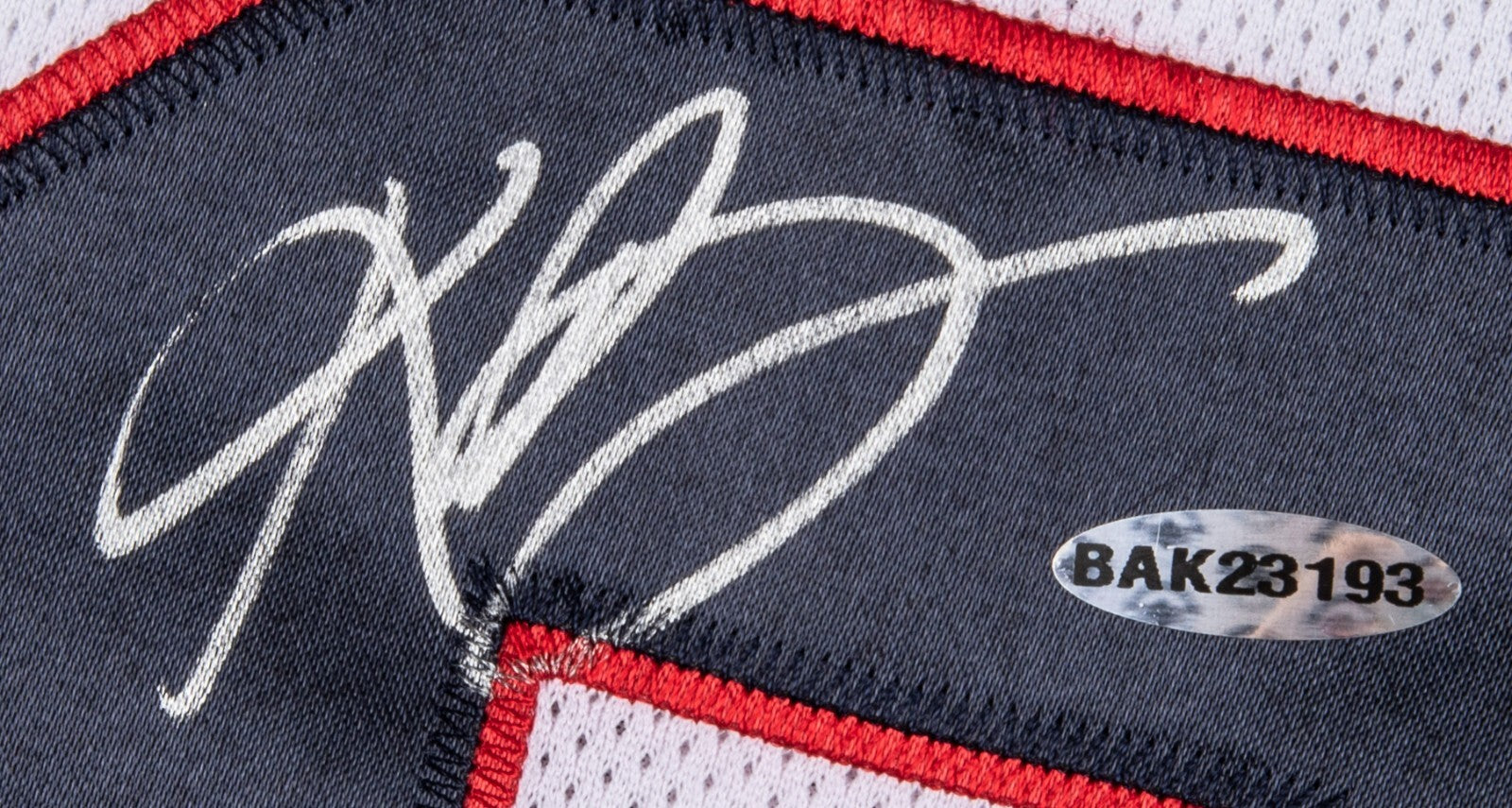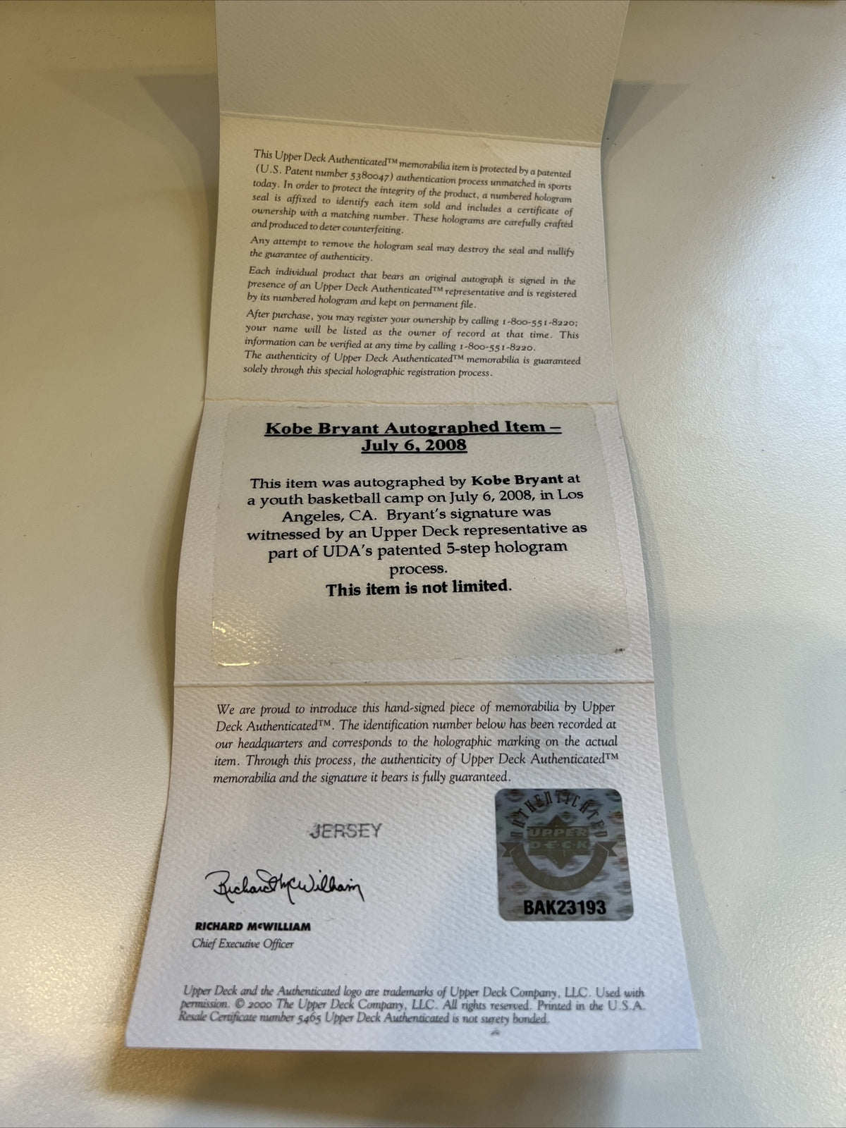 Offered is a 2008 Kobe Bryant signed white Team USA jersey. Bryant signed his name in silver marker in the upper left of the numeral "0" of his number "10" on the back of the white mesh Nike jersey. The back features "BRYANT" and the number "10" in navy blue and red tackle twill. Above his name is the "USA Basketball" logo embroidered in red, white, and blue at the neck. The sleeves and neck are edged in navy blue. The front of the jersey features the letters "U.S.A." and the number "10" in navy blue and red tackle twill. The Nike "swoosh" logo is in navy blue with red outline on the left shoulder. Bryant was a member of the USA Basketball teams that won the Gold Medal at both the 2008 Beijing Olympics and the 2012 London Olympics. This item comes with a COA from Upper Deck (BAK23193), authenticating that Bryant signed this jersey at a youth basketball camp in Los Angeles on July 6, 2008.