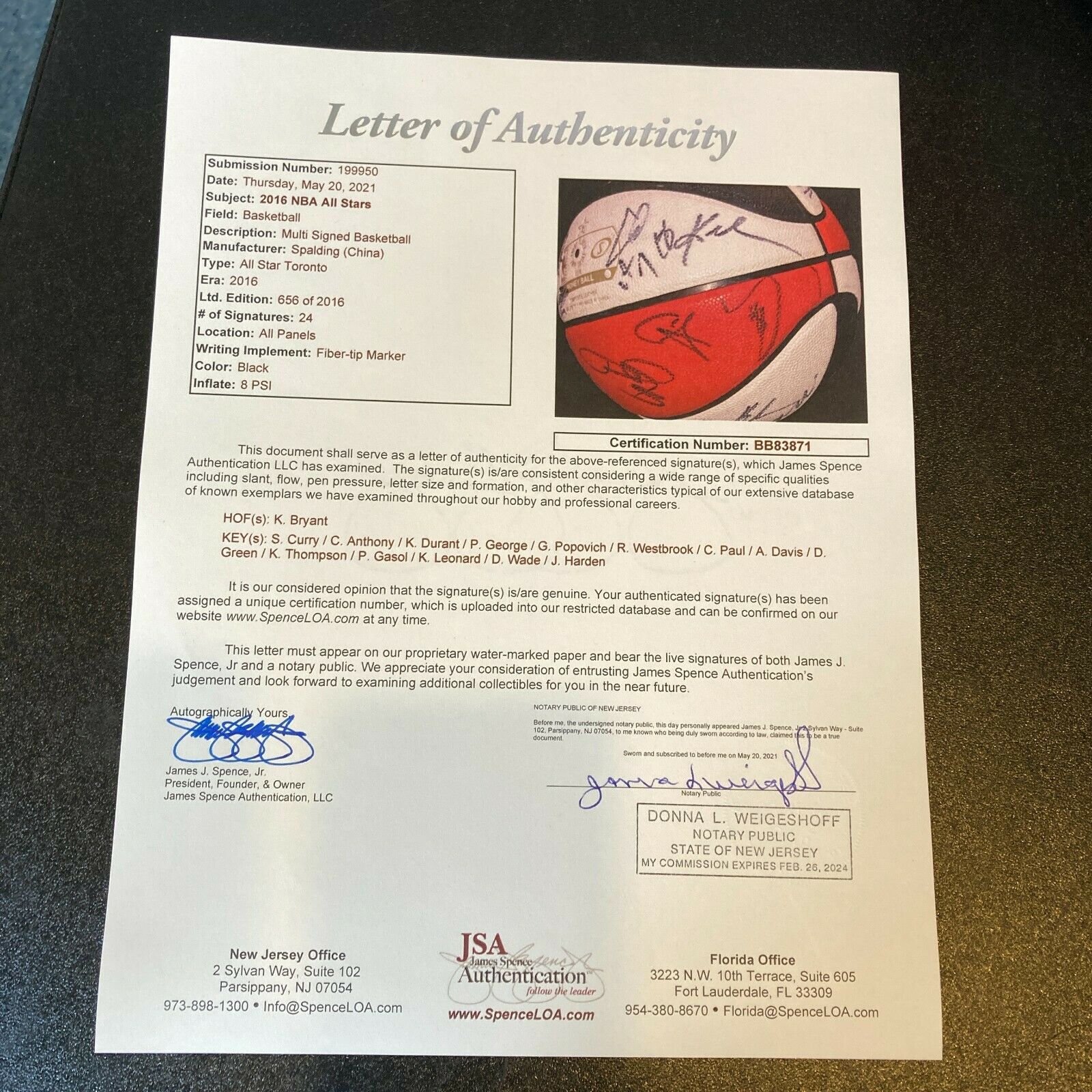 2016 NBA All Star Game Team Signed Spalding NBA Basketball. 24 signatures with Kobe Bryant, Steph Curry, James Harden, Russell Westbrook, Carmelo Anthony, Klay Thompson, Chris Paul, Pau Gasol, Chris Bosh, Dwyane Wade, John Wall, Anthony Davis, Kevin Durant and many others. See the photos for a complete list.