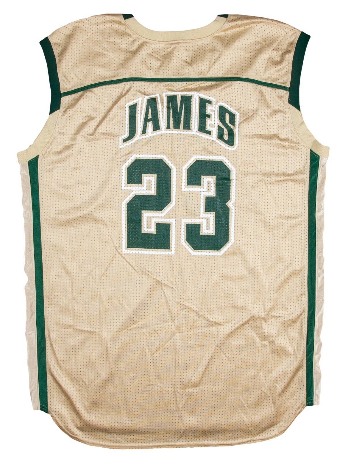 Offered is a LeBron James signed St. Vincent-St. Mary Fighting Irish #23 gold high school basketball jersey. The three-time National Basketball Association champion and NBA Finals Most Valuable Player signed his name in black marker on the lower front of the gold mesh jersey, below the green with white accent silk-screen "IRISH 23" imprint. The green elastic collar has a "Fighting Irish" logo at the V-neck in black, white, and gold, while the left shoulder has red, white, and blue stars and stripes ribbon patch sewn on. The shoulders and sides have green piping and stripes, while the sleeve cuffs are in green and gold cloth. The back of the jersey features "JAMES 23" in green with a white accent silk-screen imprint.