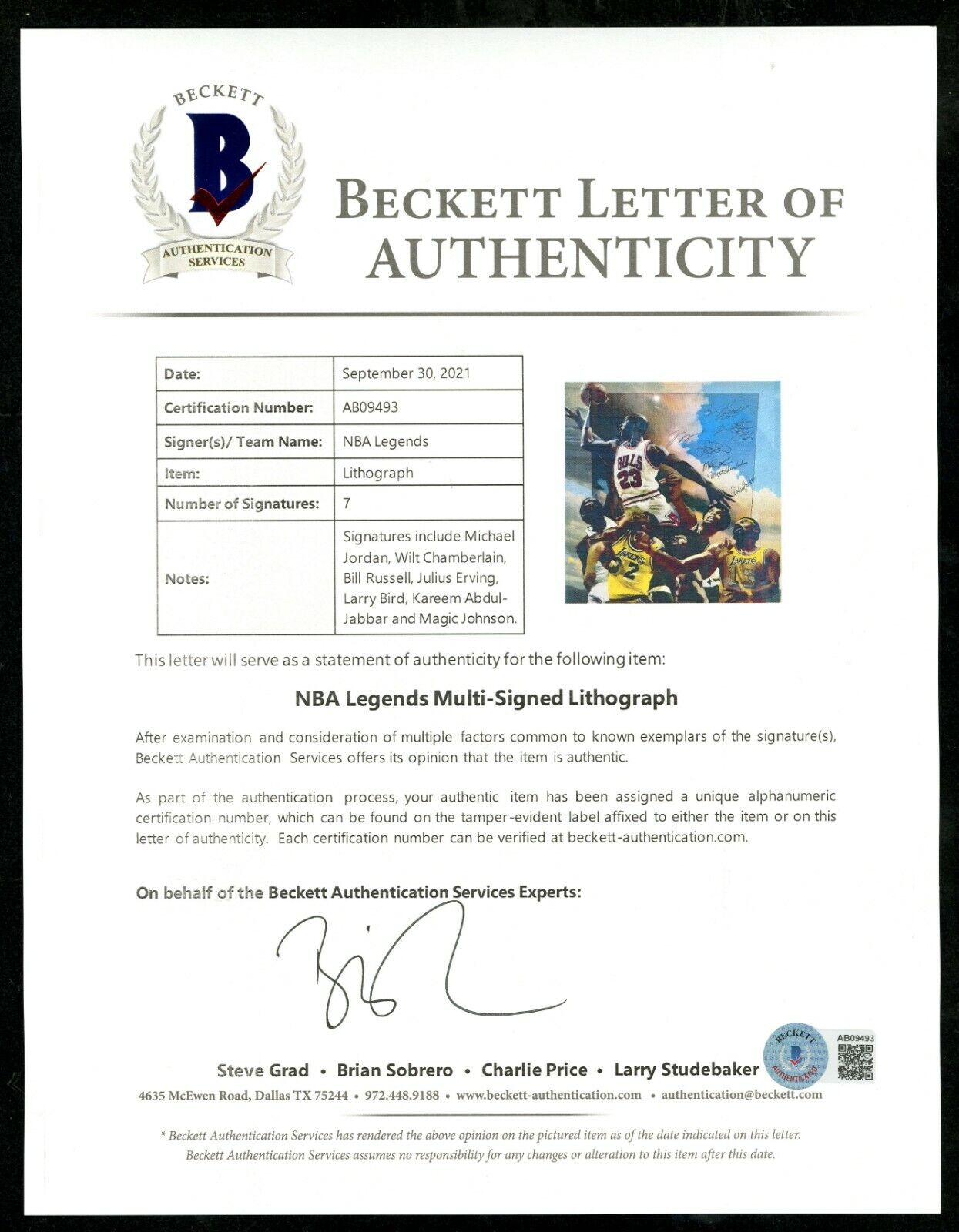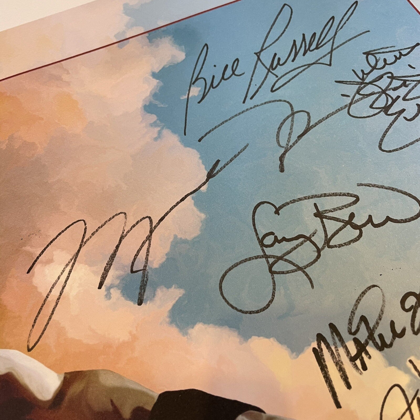 Impressive Huge 34x33 1/1 high quality Artist Proof lithograph featuring six Hall of Fame autographs including Michael Jordan, Magic Johnson, Bill Russell, Kareem Abdul-Jabbar, Wilt Chamberlain, and Larry Bird. Features an image of MJ flying above the rest of the athletes in the clouds. The lithograph, titles"Apotheosis" features bold, black autographed for excellent eye appeal. A tough-to-find piece with all of these legends' autographs penned in the same spot. A perfect addition for any NBA collector. Comes with full letter COA from Beckett. Hologram from UDA Upper Deck Authentic.