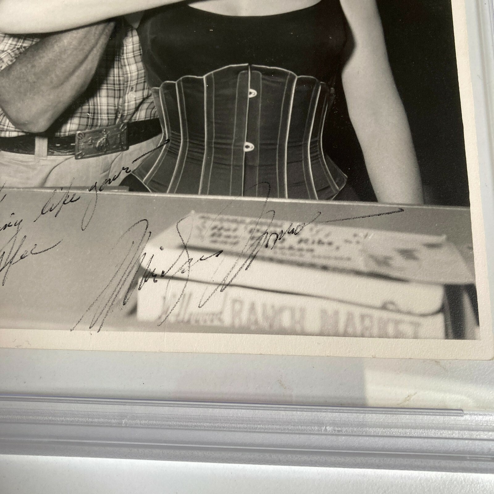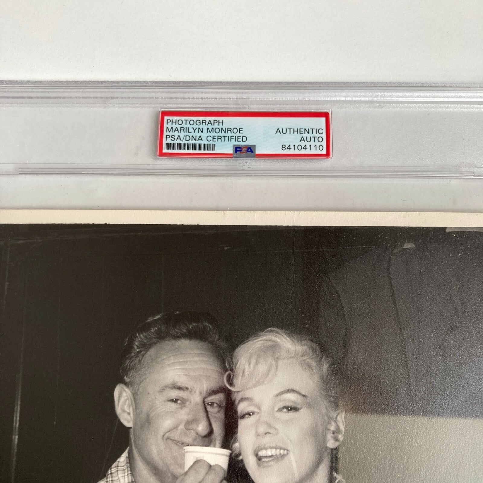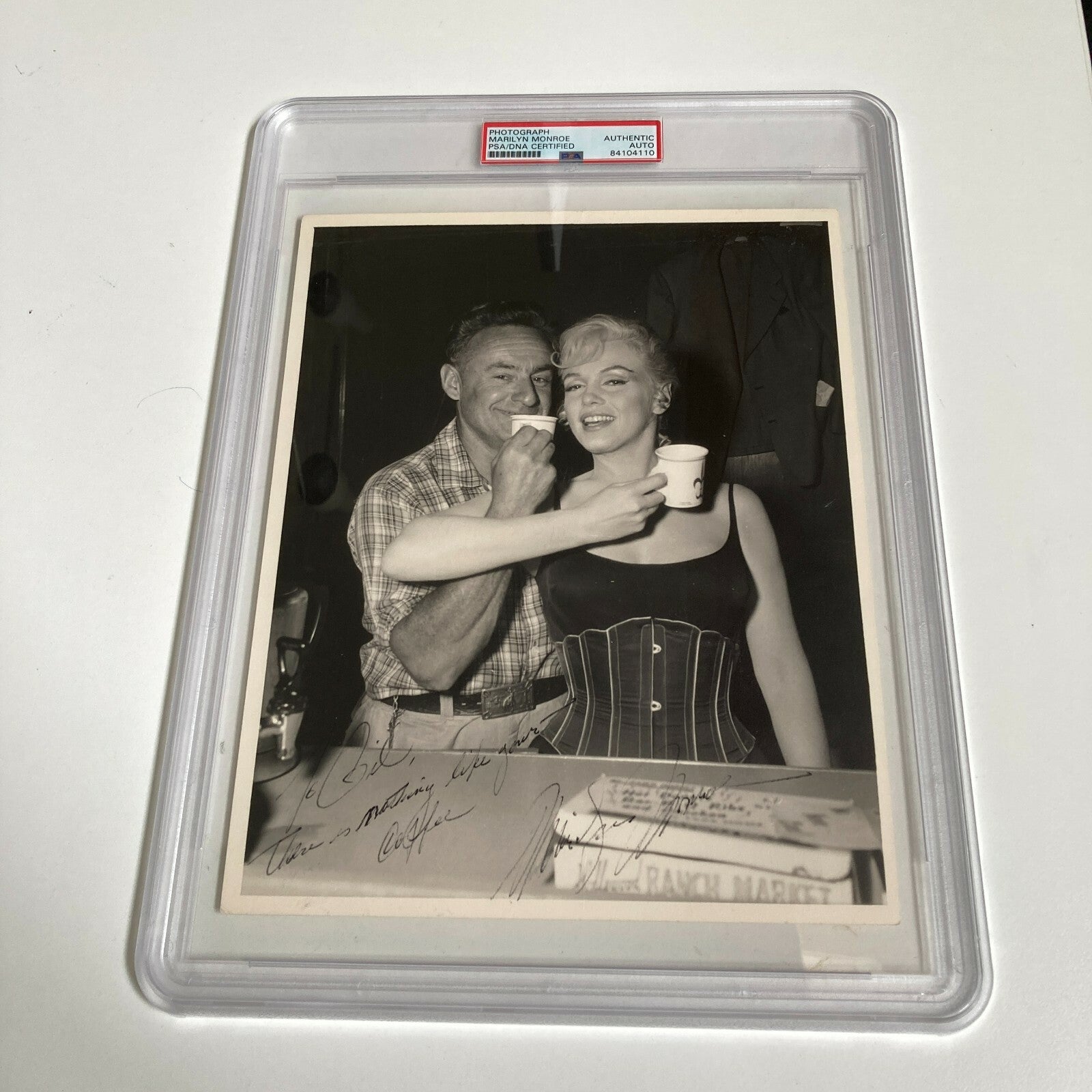 The presented black and white 8x10 photograph features Monroe, arm-in-arm, with man, sipping coffee. Monroe signed and inscribed “To Bill, There is nothing like your coffee” in black ink on the bottom of the photo. The signature and inscription are bold and clear. The signed and inscribed photograph of Marilyn Monroe comes encapsulated and authenticated by PSA/DNA (84104110)