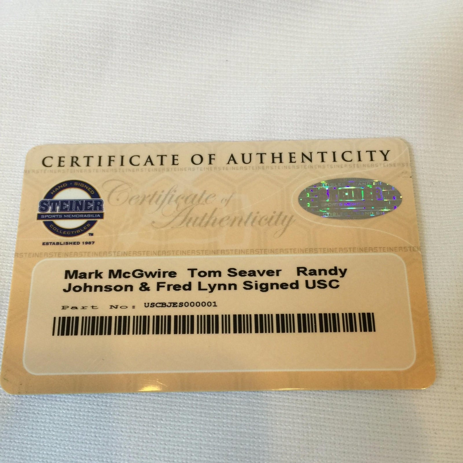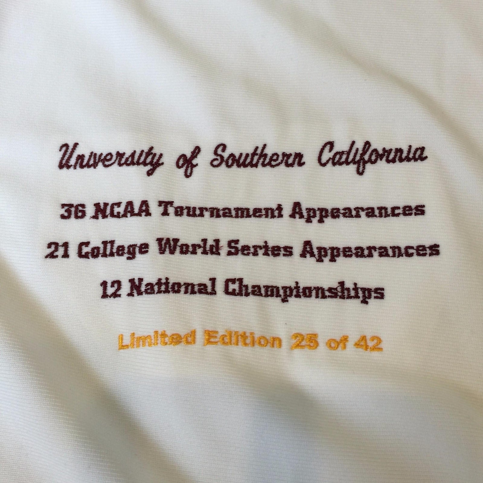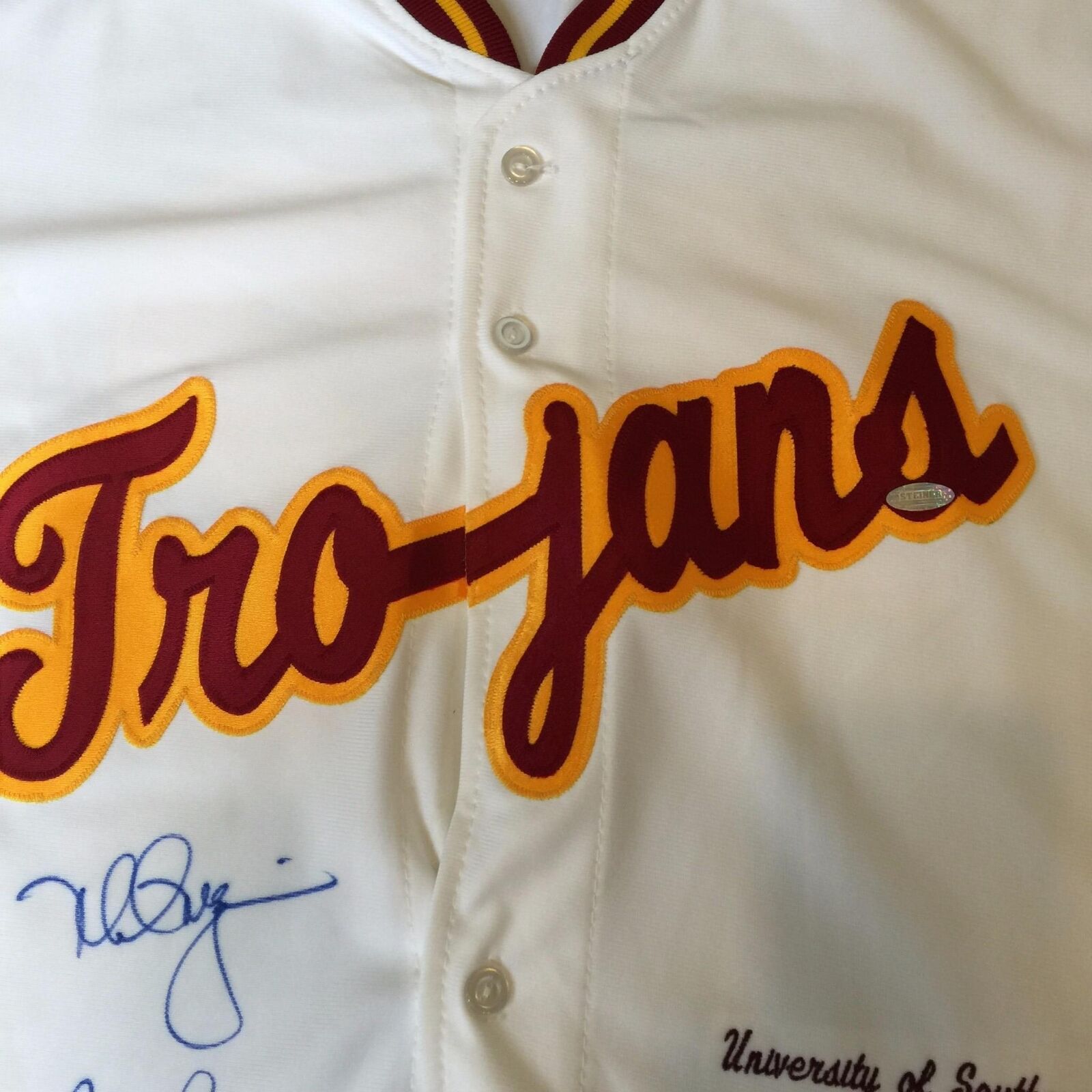 Rare Mark McGwire, Randy Johnson, Tom Seaver and Fred Lynn Signed USC Trojans Jersey. Comes with Steiner COA. Only 42 of these jerseys were produced. The jersey was once framed so the buttons don't open (It is glued shut).