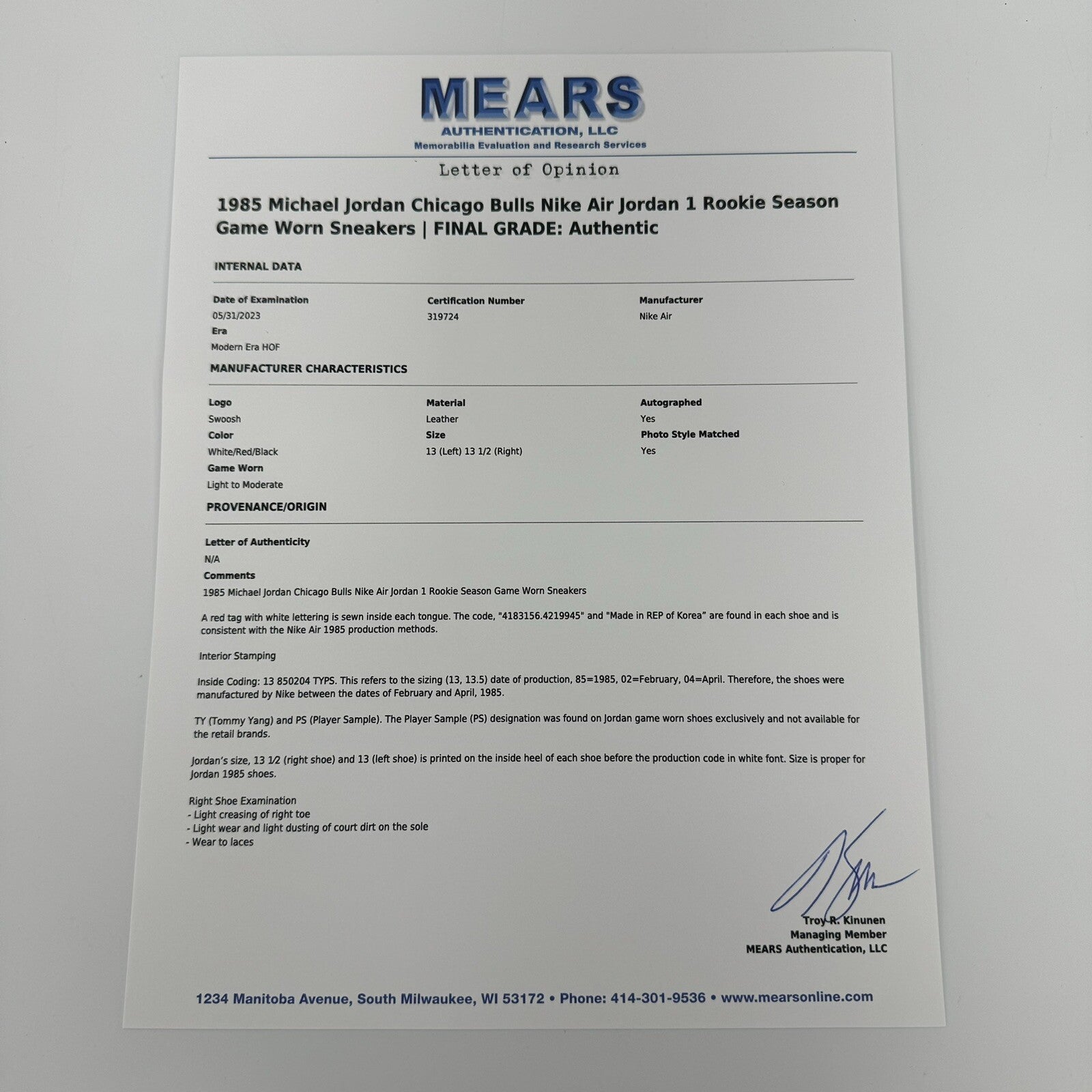 Presented here is one such prestigious pair—not only game worn by Michael Jordan, but autographed by him to boot. True to form, the left shoe is size 13, while the right is size 13.5. The interior stamped codes, "13 850204 TYPS" and "13 1/2 850204 TYPS," are found exclusively on game-worn examples and, in this case, signify that the sneaks are "PS" Player Samples manufactured between February and April of 1985 at the "TY" Tong Yang factory in Korea. According to the MEARS LOA, "A thorough review of the shoes with the aid of a black light and digital microscope found no evidence of fabricated wear, removal of materials, or foreign addition of materials. The physical manufacturing traits are consistent with the Nike Air design. Both shoes exhibit an even level of light to moderate game wear." Jordan's signature is a black-marker beauty on the right shoe's inside upper ankle.