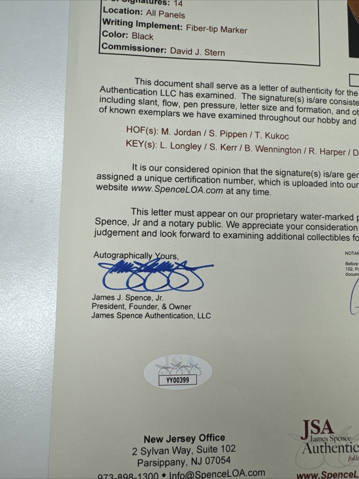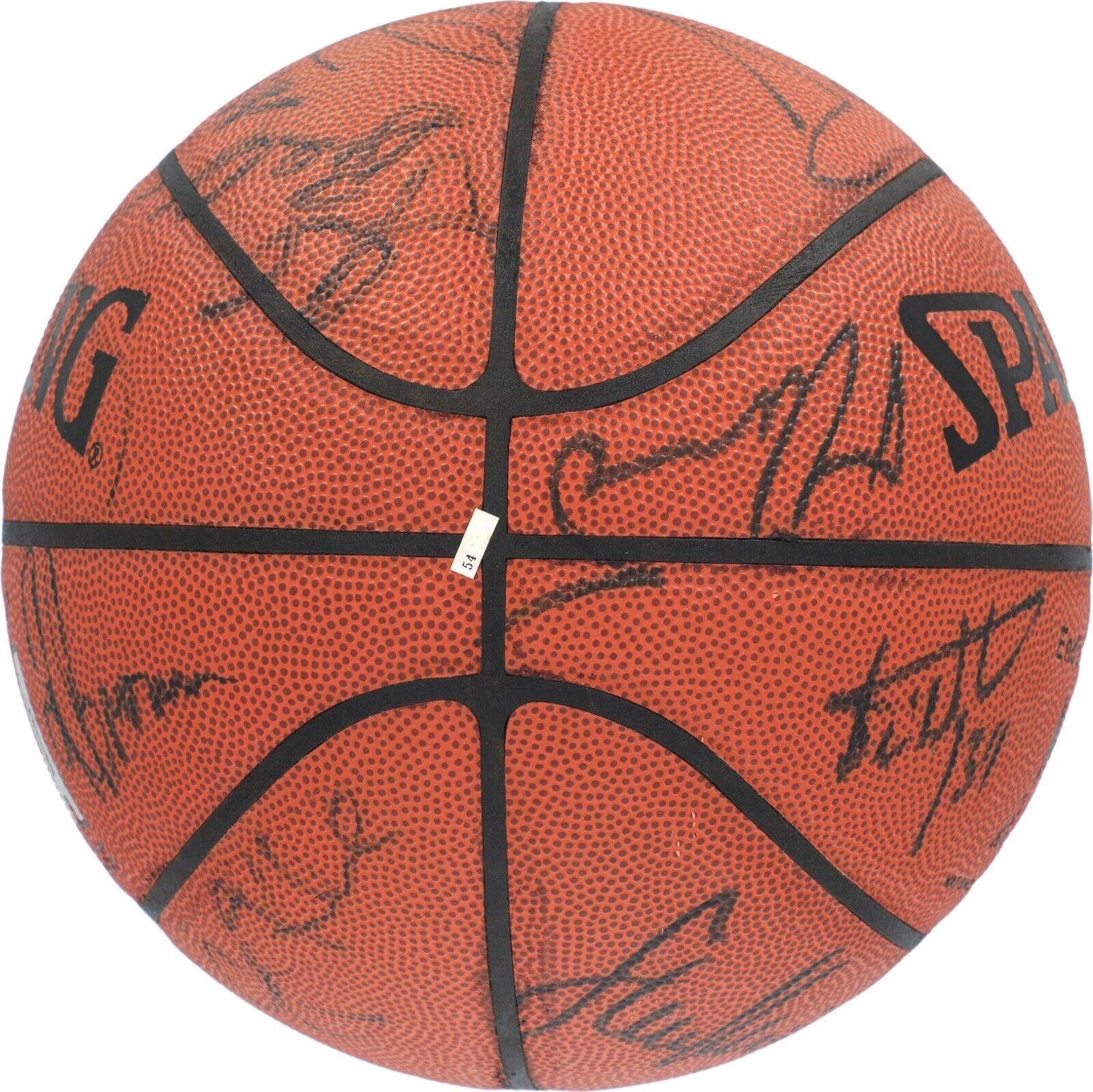 Offered is a Spalding Official NBA basketball that has been signed by 14 members of the historic 1997-98 Chicago Bulls. Signatures on the ball include Michael Jordan, Scottie Pippen, Steve Kerr, Toni Kukoc, Jud Buechler, Scott Burrell, Jason Caffey, Luc Longley, Randy Brown, Ron Harper, Joe Klein, Bill Wennington, Keith Booth, and one other. The ball is in good condition with all signatures executed in bold black felt tip marker. It comes with an LOA from JSA for the signatures.