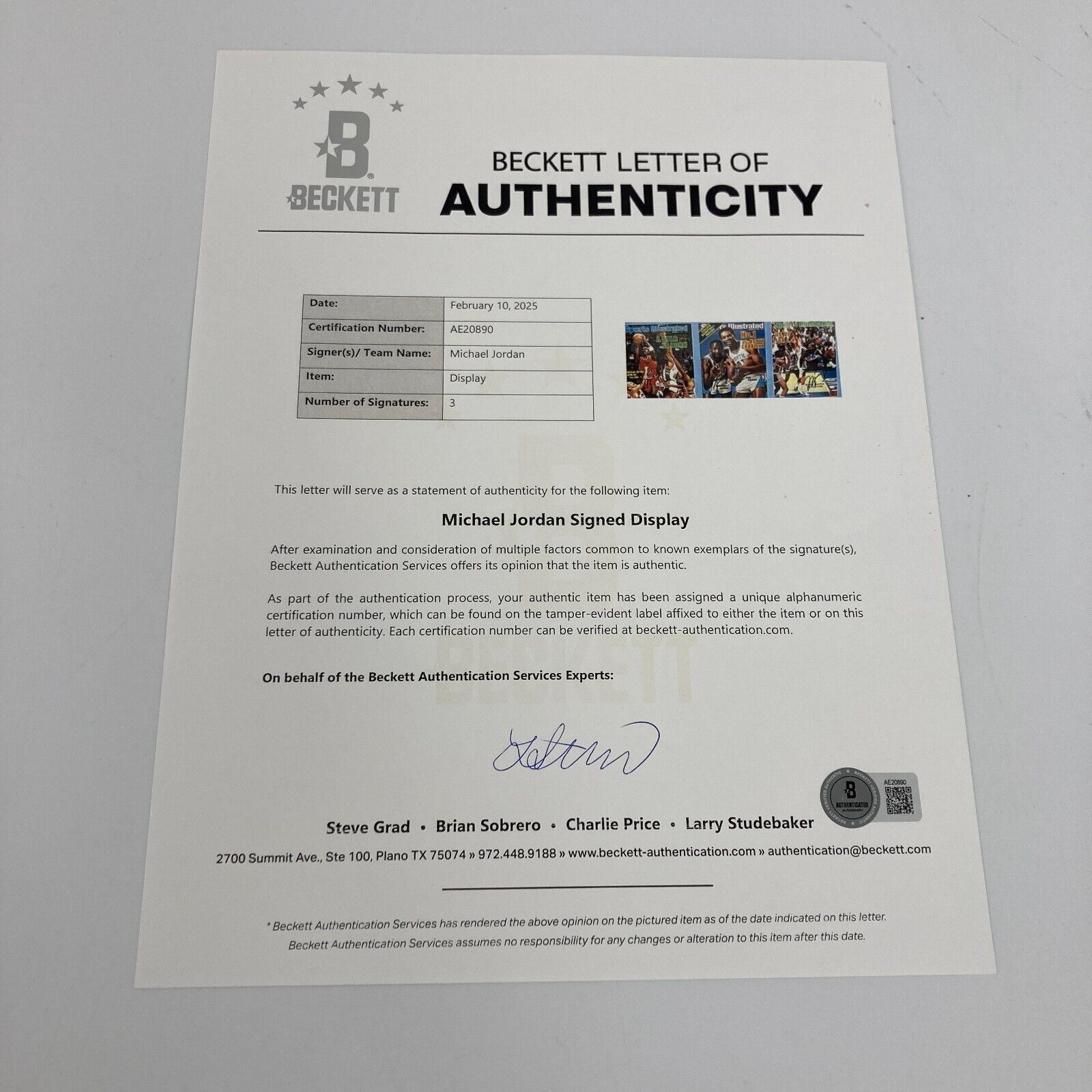 Michael Jordan Signed Sports Illustrated Cover Lot of 3 Display. Michael Jordan graced Sports Illustrated covers 50 times, symbolizing his unparalleled influence in sports. Their relationship soured in 1994 after a critical baseball article. Despite this, Jordan's legacy remains immortalized through SI's iconic covers, showcasing his greatness and cultural impact. Here we present an interesting display featuring oversized Photos of his first three covers, and each have been signed by Jordan in Mint sharpie. Framed and matted at 19x37", each cover print measures 12.5x9.5". UDA hologram on each. Full LOA from PSA/DNA. Full LOA from Beckett Authentication Services.