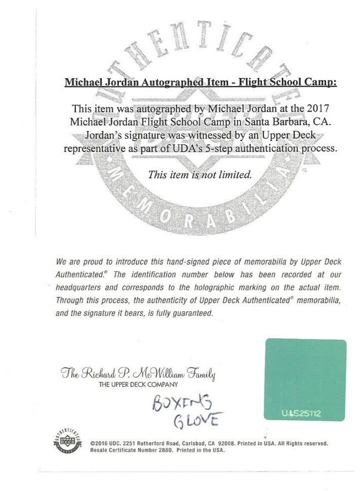 The right-handed Everlast glove is signed by both legends with a black marker. An Everlast tag appears on the outside wrist. The glove comes with an LOA from JSA (Z41923) for Ali's signature and a COA from Upper Deck Authenticated (UAS25112) for Jordan's signature.