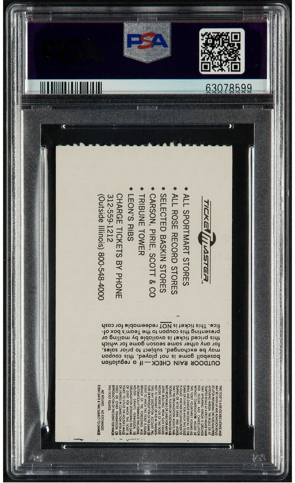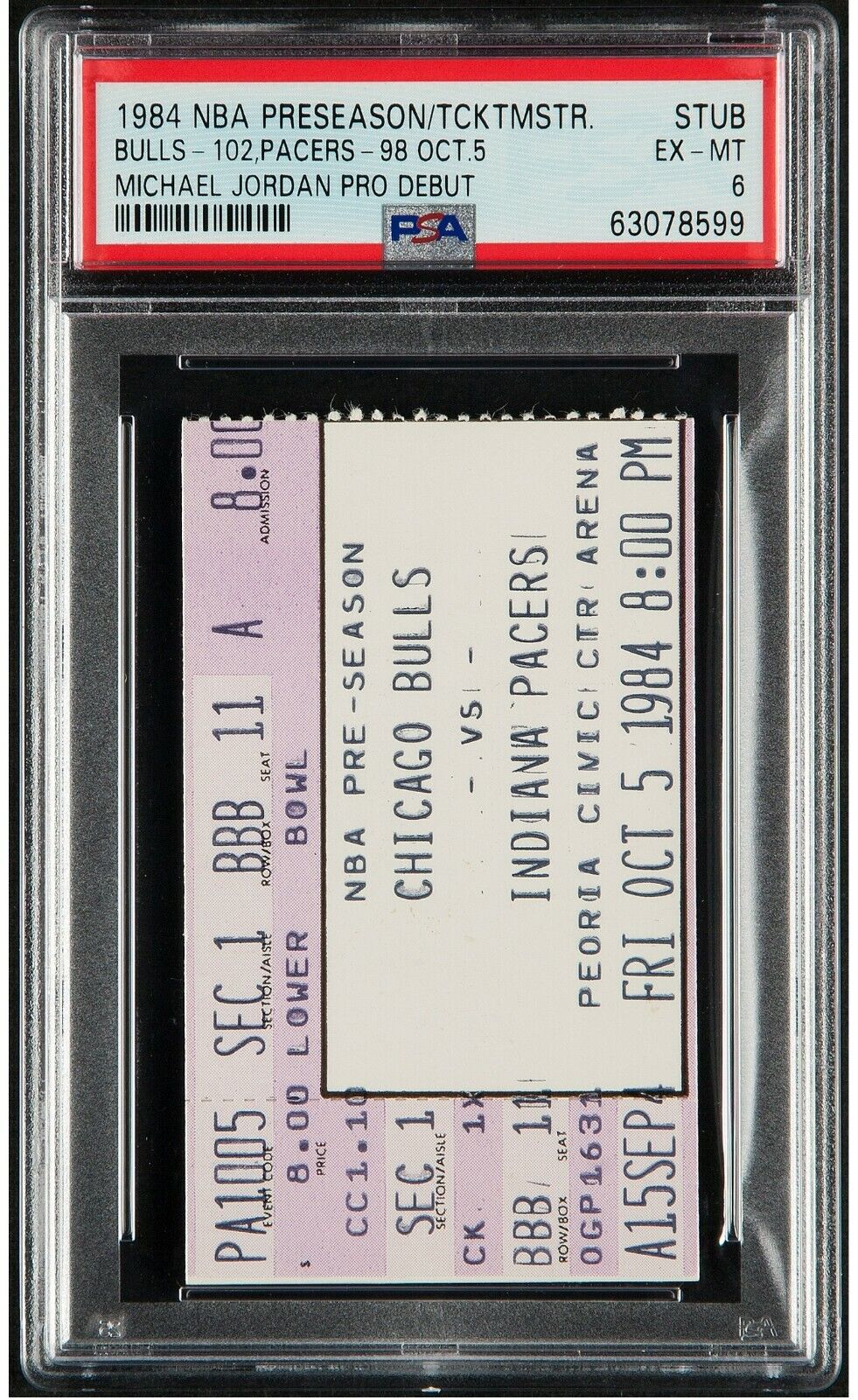 On October 5, 1984, NBA fans got their very first look at a budding legend, as the Michael Jordan era of the Chicago Bulls began. Jordan would immediately make his presence known, scoring eighteen points in twenty-nine minutes to lead his team to a 102-98 victory at the Peoria (IL) Civic Center Arena. Just five stubs from this preseason contest marking the professional debut of the sport's greatest star appear in the PSA population report, and this one stands alone at the top, two points superior to the next finest example as of the time this text is written. Jordan tickets have been the hottest market in the hobby. Encapsulated by PSA, EX-MT 6.