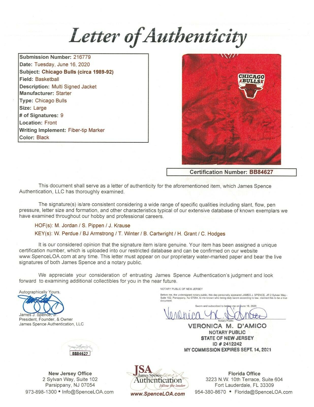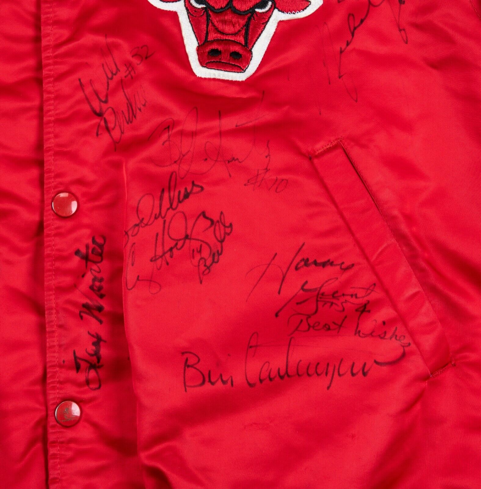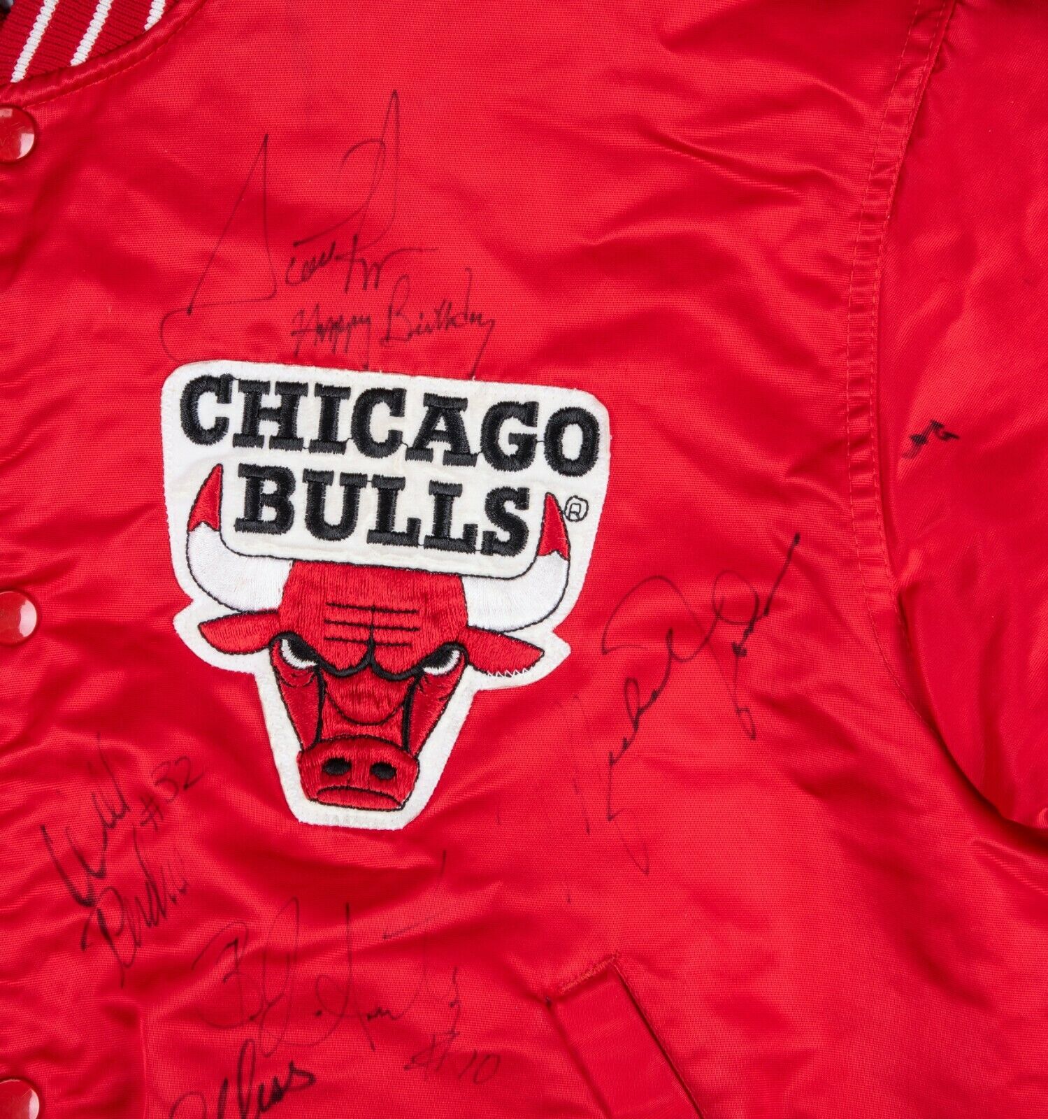 Stunning red Chicago Bulls warm up jacket signed by numerous members of the early 1990’s Chicago Bulls, including the Hall of Famers Michael Jordan and Scottie Pippen. The Bulls of the 1990’s were the toast of the NBA, winning six titles between 1991 and 1998. This offered jacket boasts the crisp signatures of many crucial Bulls players, with the signatures of Jordan and Pippen standing out. Pippen has inscribed “Happy Birthday” in addition to his signatures. Other signatures on this button-down jacket include Will Perdue, Horace Grant, BJ Armstrong, Craig Hodges, Tex Winter, and others. The signatures have been written in black marker. This jacket comes with a LOA from JSA.