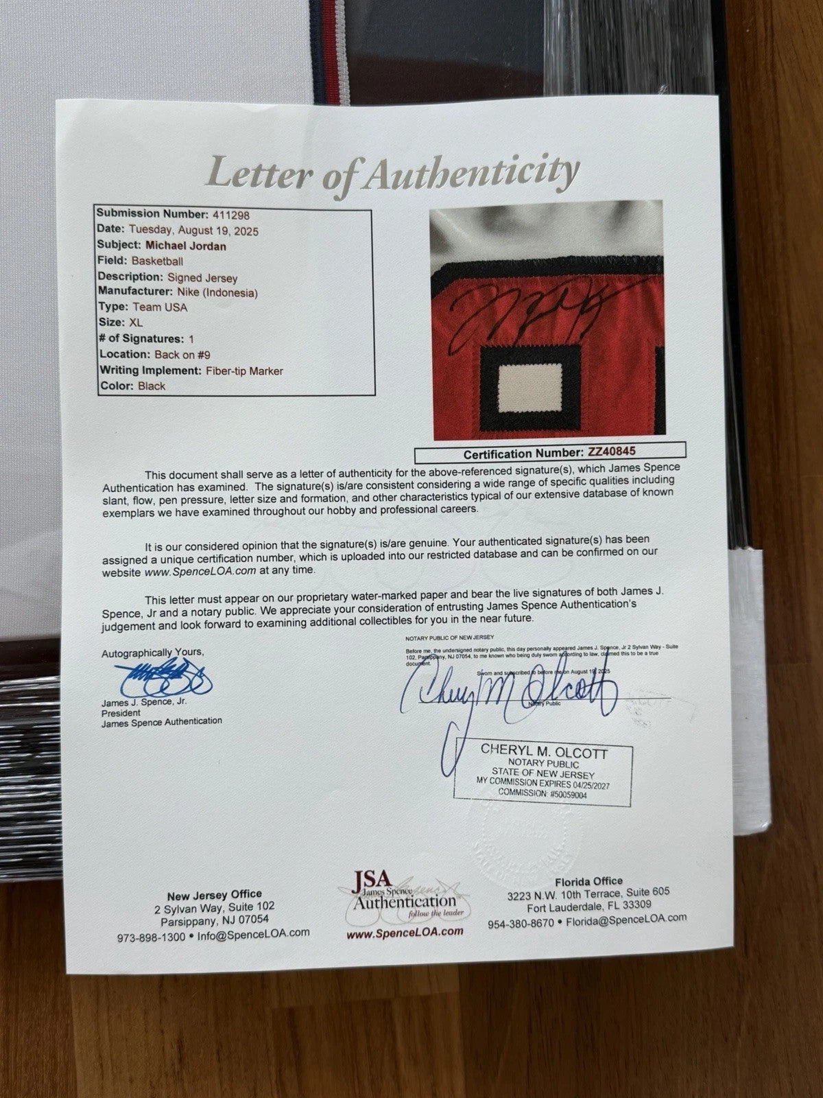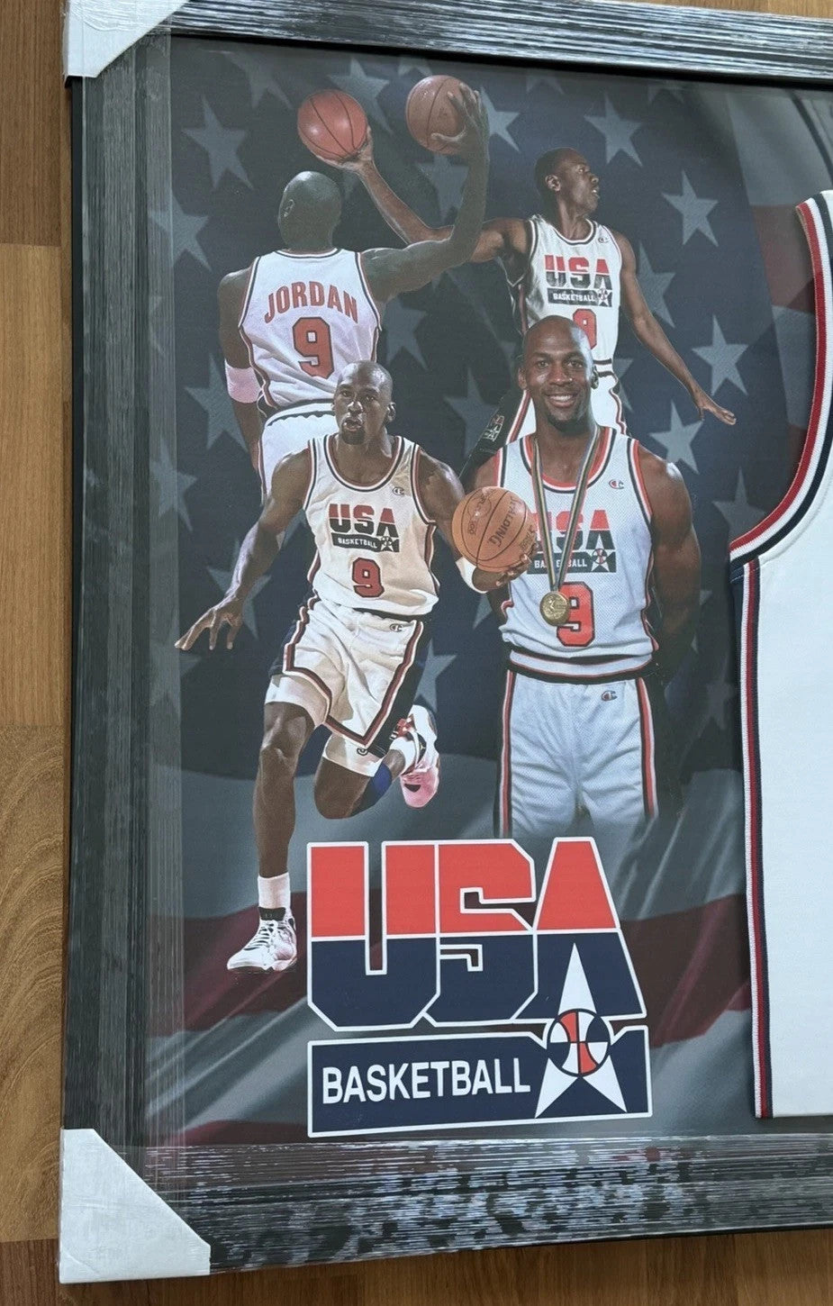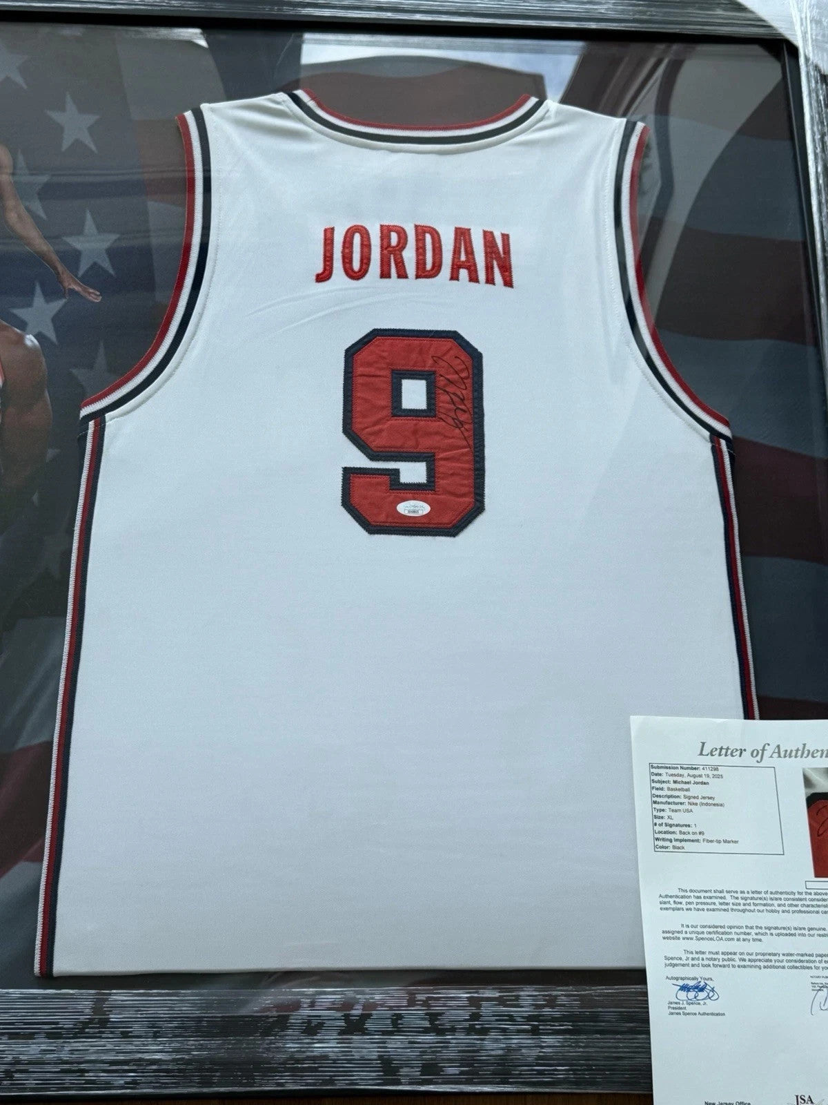 Up for sale is a Michael Jordan signed and professionally framed Team USA jersey. The frame is brand new and measures 35x43”. Signed in black marker on the #9. Comes with a full JSA letter of authenticity.