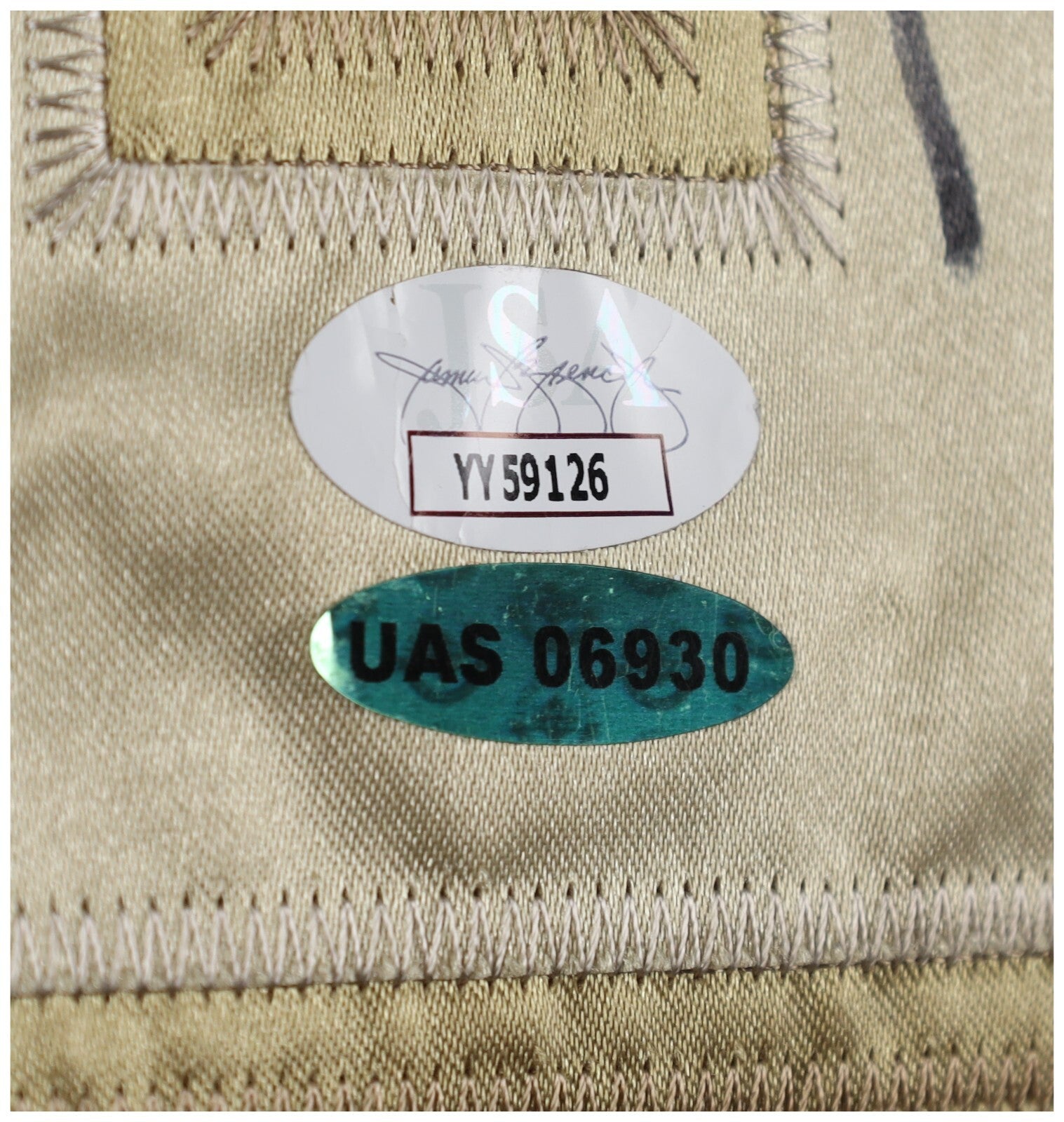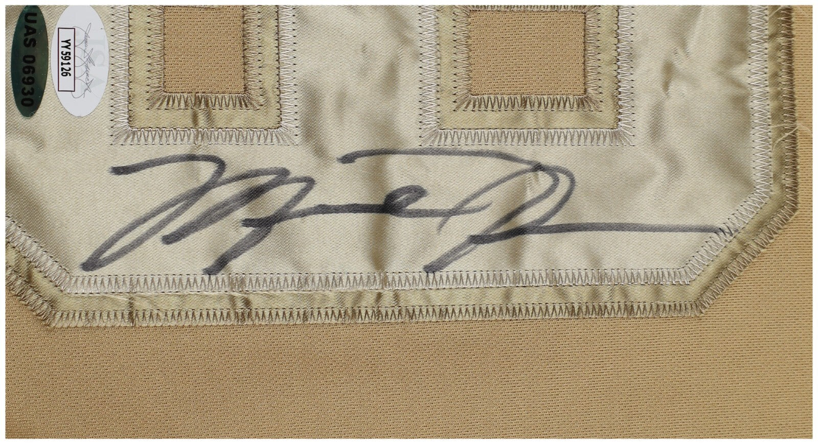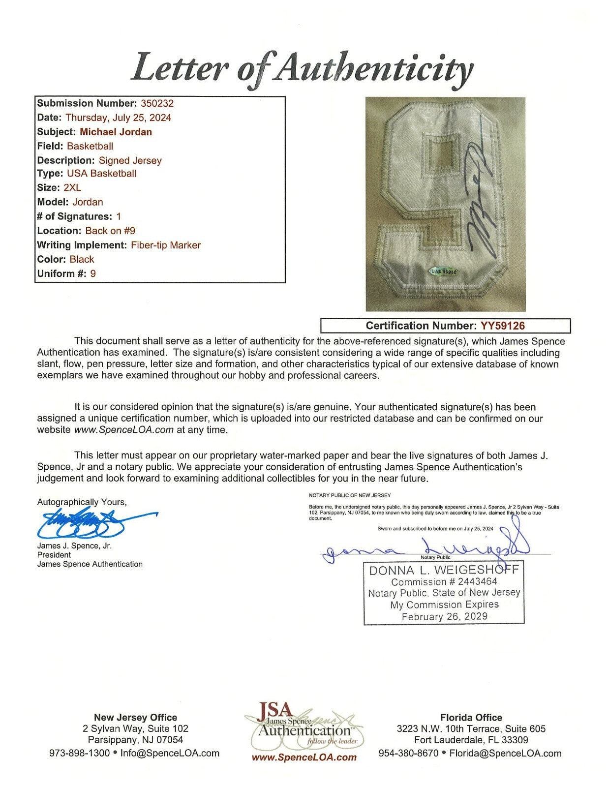 Offered is an Authentic Nike gold USA Basketball #9 Jordan jersey signed by "His Airness." The jersey features all numbering and lettering in tackle twill. A gold Nike logo rests on the left shoulder. A Nike 2XL manufacturer's tag with an "8-0" flag rests on the left front tail. A gold tag labeled "MCMXCII USA BASKETBALL DREAM TEAM TO THE VICTOR GOES GOLD," rests on the left front tail. A gold swatch labeled "MICHAEL JORDAN" rests below the Nike tag. The limited edition (#298/369) flag rests on the left lateral side. Jordan placed a vertical black marker signature across the number "9" on the jersey's back.The jersey comes with a hologram only from UDA (UAS06930), and a full letter LOA from JSA for the signature.