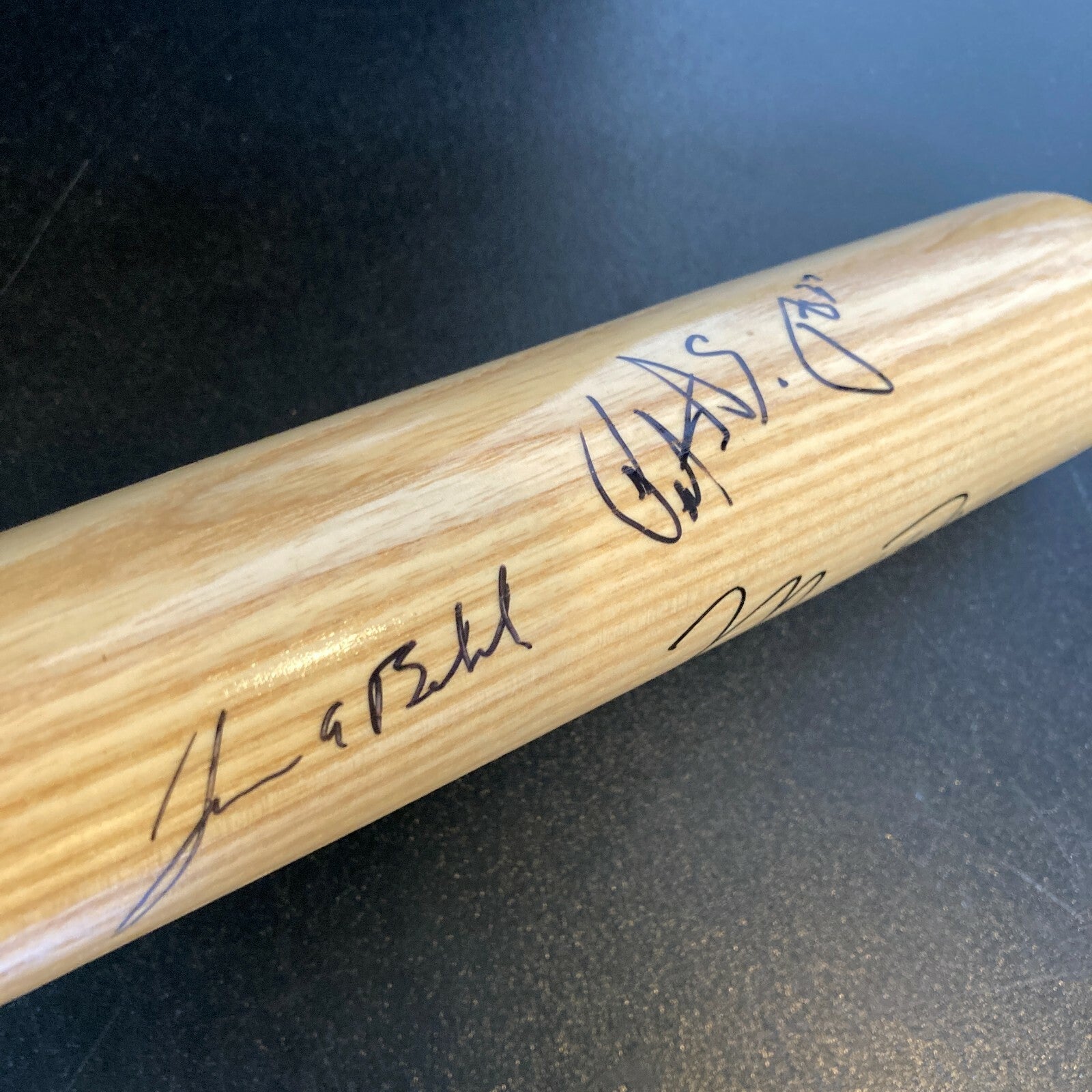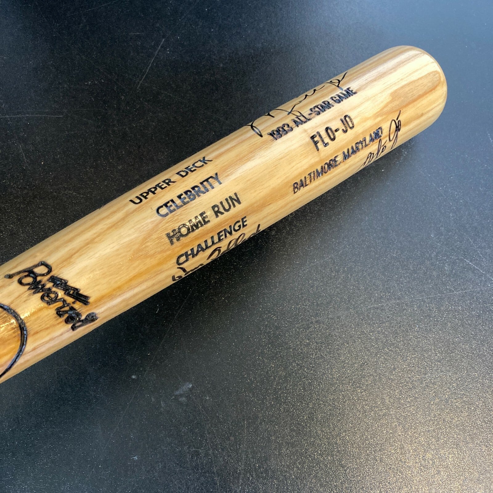 Presented here is a Louisville Slugger game model Upper Deck Celebrity Home Run Challenge Bat signed by seven participants of the 1993 Celebrity Home Run Challenge at Camden Yards in Baltimore, Maryland on July 12, 1993. The charity event featured celebrities attempting to hit home runs in the name of charity, with Jordan winning the event with the furthest shot. In an act of foreshadowing, Jordan would don a Chicago White Sox uniform, the same team whose farm system he would play Minor League Baseball with when he abruptly retired from basketball during the fall of 1993. The event was known for an enthusiastic Tom Selleck, the star of the film “Mr. Baseball,” who hit the only home run over the right-field scoreboard. The presented bat features “125 LOUISVILLE SLUGGER” and “POWERIZED” stamped in black on the barrel of the bat. “UPPER DECK CELEBRITY HOME RUN CHALLENGE” appears stamped in black on the midsection of the barrel. “1993 ALL-STAR GAME FLO-JO BALTIMORE, MARYLAND” is stamped on the top barrel of the bat in black. The bat features seven signatures from athletes and stars and includes signatures from Hall of Fame basketball players Michael Jordan and Patrick Ewing, actors Tom Selleck, Jim Belushi, and Bill Murray, former NFL running back and sportscaster Ahmad Rashad, and Olympic Gold Medalist Florence “Fl-Jo” Griffith Joyner. All seven of the signatures are bold and in black marker and appear on the barrel of the bat. The signed Upper Deck Celebrity Home Run Challenge “Flo-Jo” bat signed by seven legends of the court, field, and screen comes with an LOA from PSA/DNA (AF02021) and a Hologram from UDA Upper Deck