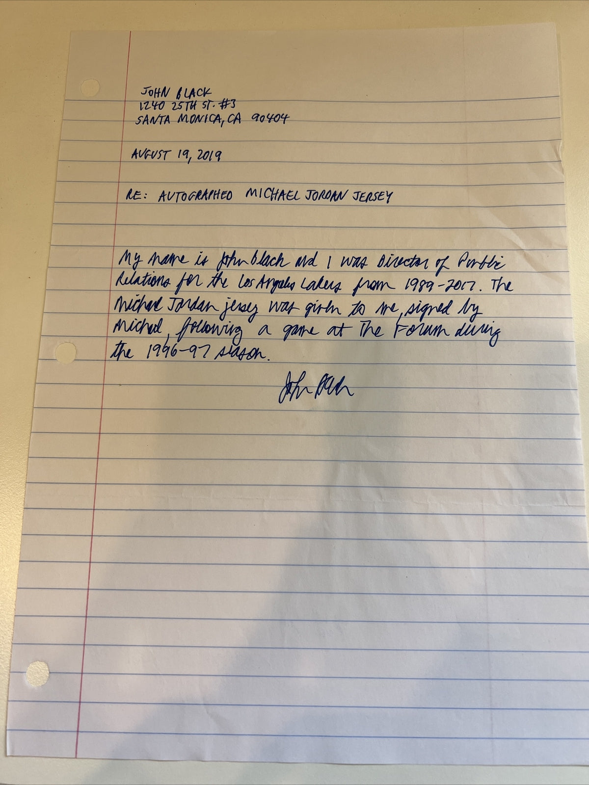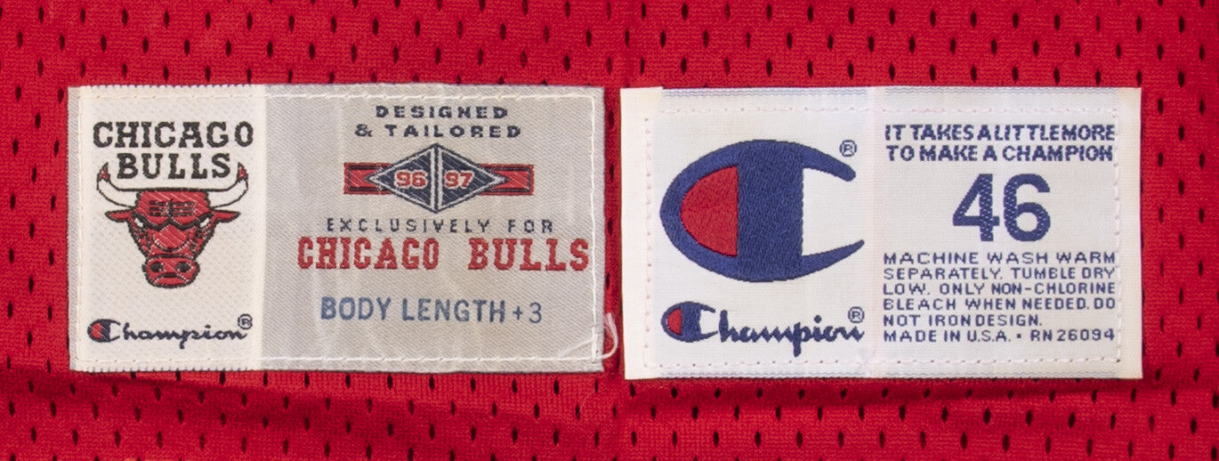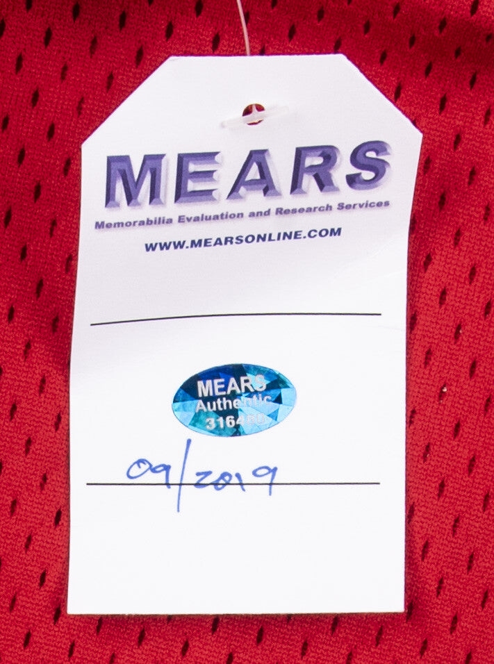 This Michael Jordan game issued red 1996-97 Chicago Bulls Road jersey features “BULLS” sewn on the front in black-on-white tackle twill and “JORDAN” on the back in black-on-white tackle-twill. Jordan’s iconic number “23” is sewn onto the front and back in the same manner. The jersey is size 46, and has a “BODY LENGTH +3” tag, indicating that it was tailored for Jordan’s specifications. The open arms and collar have a white, black, and red-ribbed border. The NBA logo patch is sewn onto the left shoulder in gold, which was unique for the 1996-97 season, commemorating the 50th Anniversary of the NBA. Jordan has signed this jersey in black marker to the left of his number on the reverse. This jersey comes with an LOA from MEARS (316480), receiving a grade of A5. It also comes with an LOA from JSA (Z89845) for Jordan’s signature.