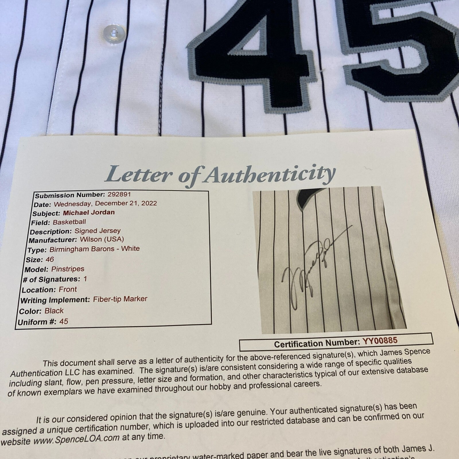 Michael Jordan autographed Birmingham Barons jersey. Pinstriped jersey has "Barons" team name across the front with number "45" below. Number also appears on back. Wilson tag in the collar (noting size 46) and it appears that an additional tag is removed from the lower front tail. The jersey appears to be of professional quality. Comes with full letter JSA COA.