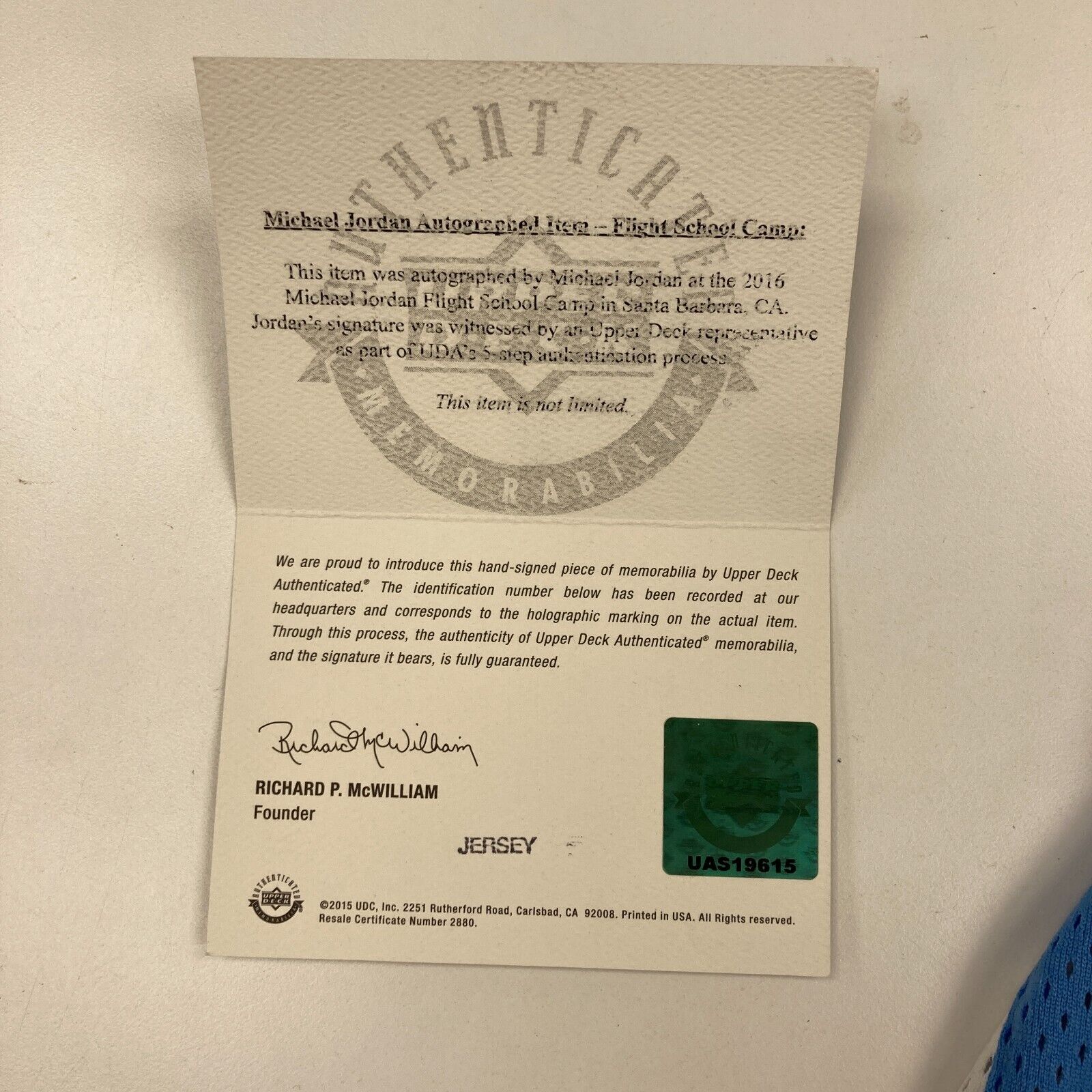 Before Michael Jordan starred for the Chicago Bulls, he was a transcendental college player at the University of North Carolina at Chapel Hill. Jordan showed flashes of his incredible potential while at UNC, averaging 17 points per game over his career and hitting the game-winning shot against Georgetown in the 1982 NCAA Championship game as a freshman. The third overall pick in the 1984 NBA Draft, Jordan has remained heavily involved with UNC even after his playing days. Offered is a North Carolina Tar Heels #23 jersey signed by Jordan. The jersey features all the numbering and lettering screen-printed on the jersey. A Jordan North Carolina Eighty-Four National Champions tag rests on the front left tail. Jordan placed a black marker signature across the number "2" on the jersey's back. The jersey comes with a COA from UDA (UAS19615), stating the jersey was signed at the Michael Jordan Flight School Camp held in Santa Barbara in 2016.
