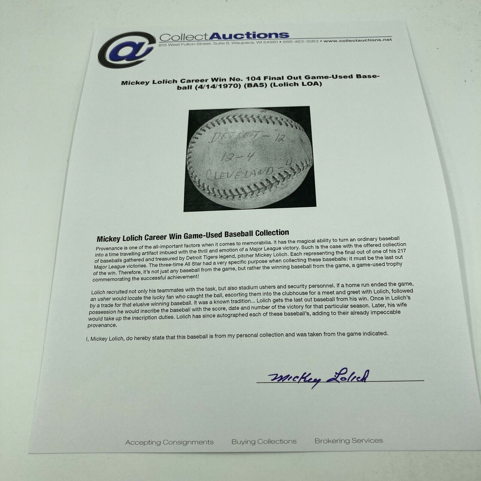 Comes with full letter Certificate Of Authenticity from Beckett as well as a signed Letter Of Provenance from Mickey Lolich.