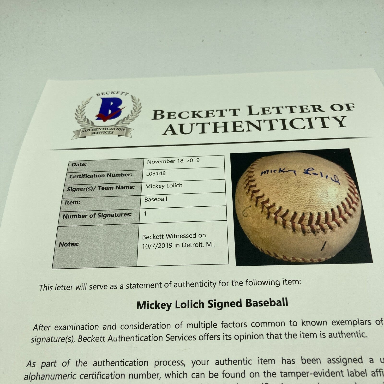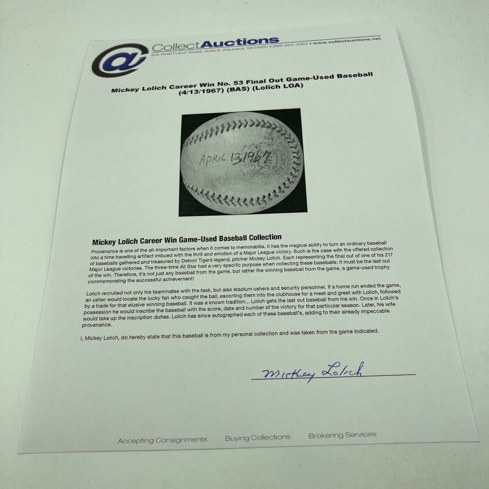 Complete game 6-3 win at California - six hitter and first win of 1967. This baseball arrives with a full LOA from Beckett in regards to the signature, as well as a LOA from Mickey Lolich.