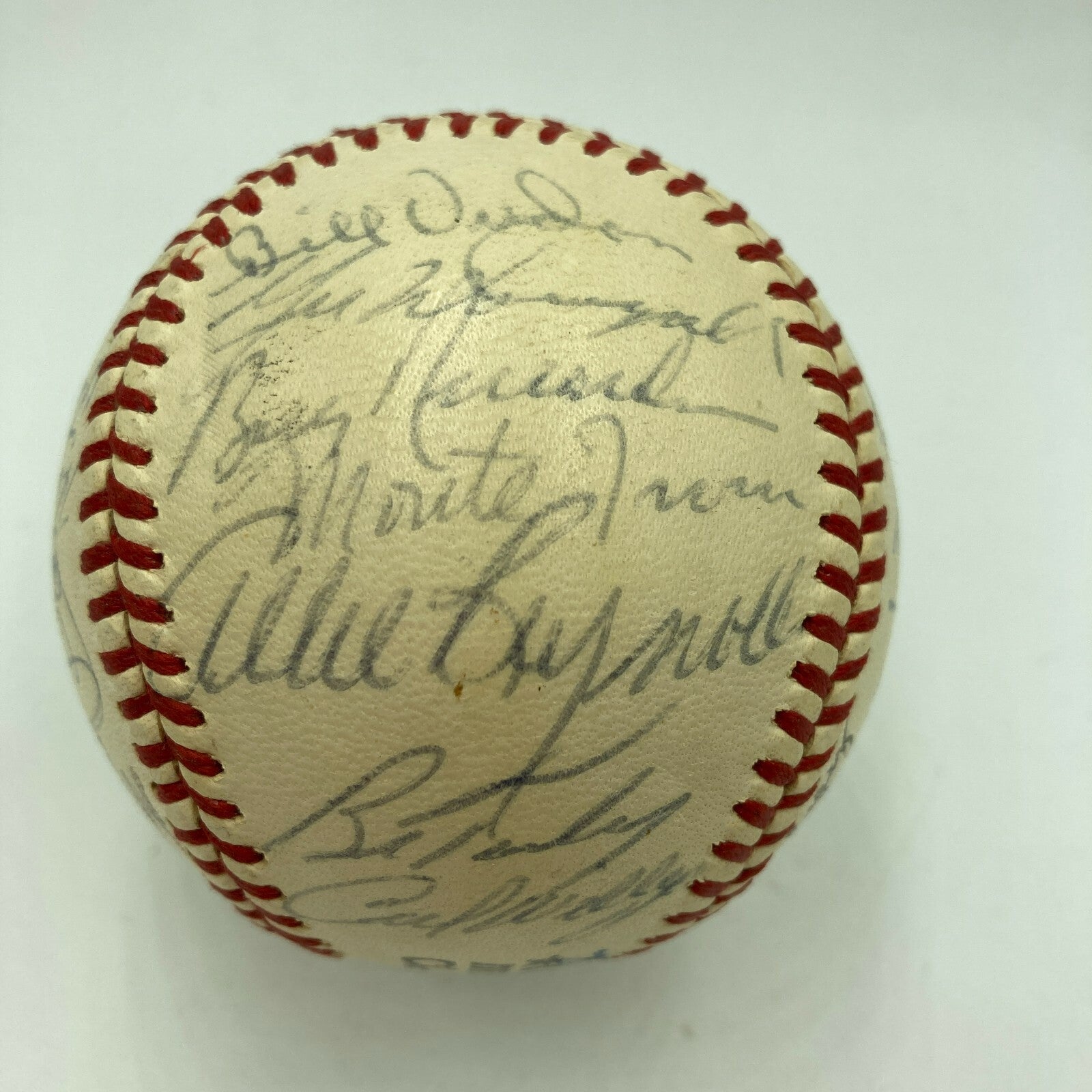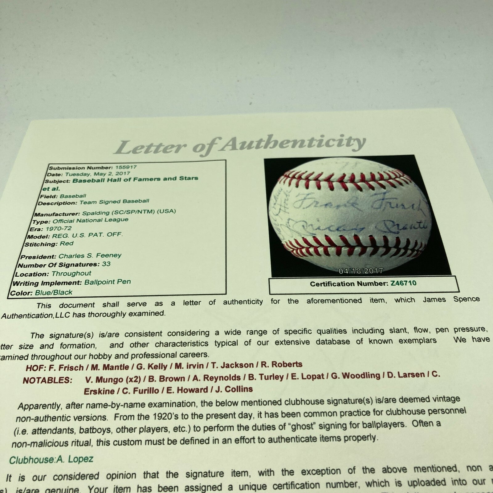 New York Yankees, Giants and Dodgers Hall Of Famers and Legends multi signed baseball. Spalding Official National League Feeney baseball signed by 33. The signatures cover the ball and are highlighted by Hall of Famers Mickey Mantle, Frankie Frisch, George “High Pockets” Kelly, Monte Irvin, Travis Jackson and Robin Roberts. Also included are Van Mungo, Brown, Reynolds, Turley, Lopat, Woodling, Larsen, Erskine, Furillo, Elston Howard, Collins and more.