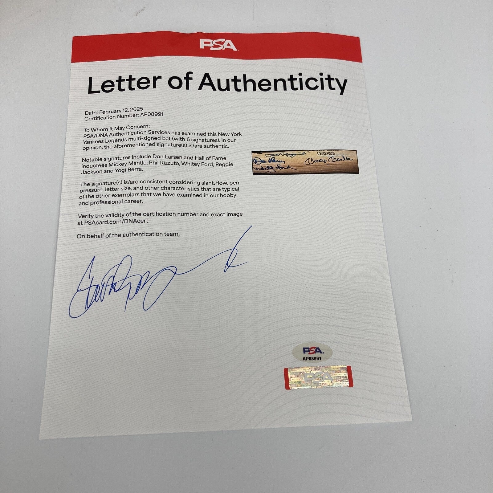 Louisville Slugger bat signed by New York Yankees legends Mickey Mantle, Yogi Berra, Reggie Jackson, Phil Rizzuto, Don Larsen, and Whitey Ford. This P72 model Louisville Slugger bat has "Bronx Bombers," "New York Yankees," and "Legends" engraved in the barrel in all capital letters. The bat is 34" long and is in near-mint condition. Each player signed the bat in blue ink. Comes with a full LOA from PSA.