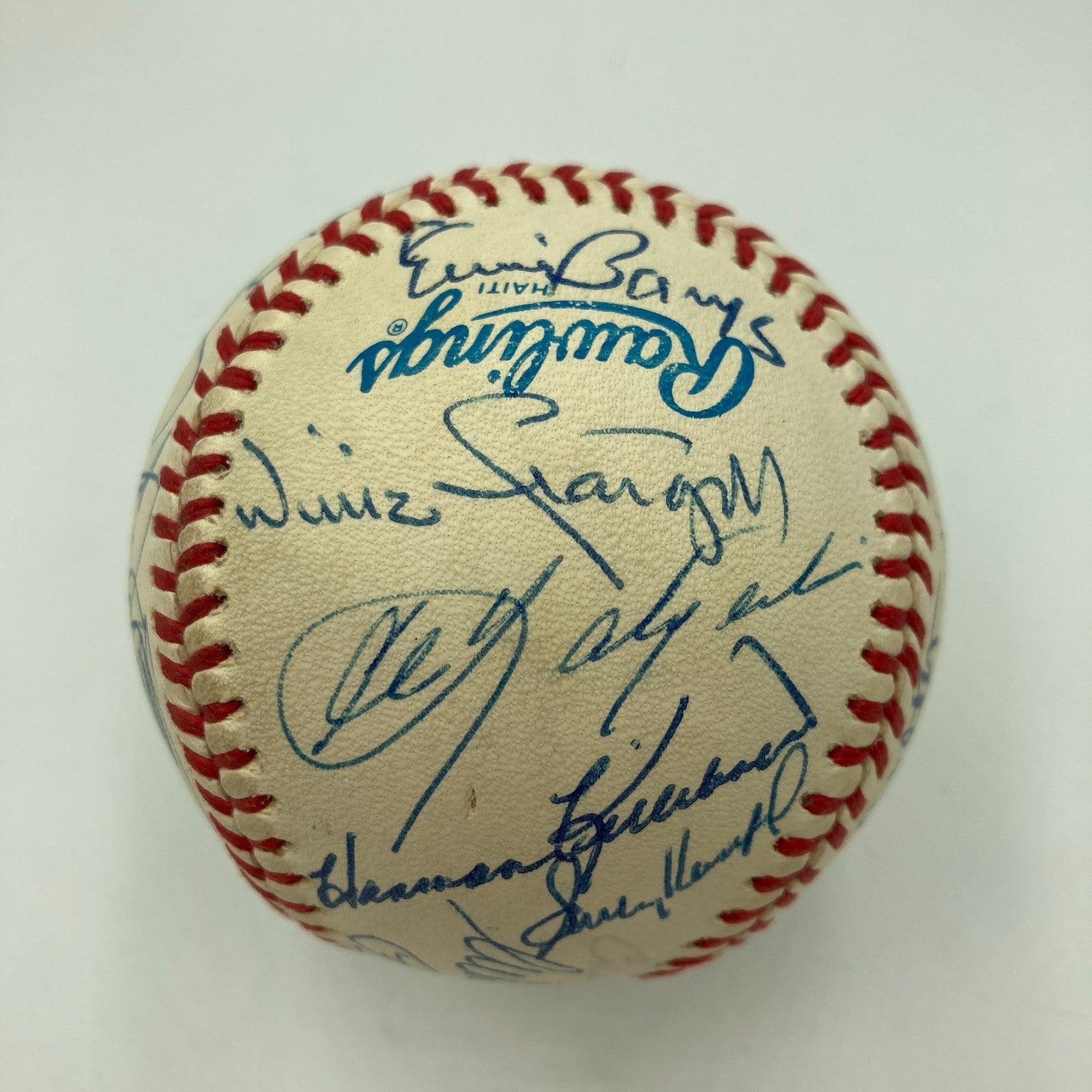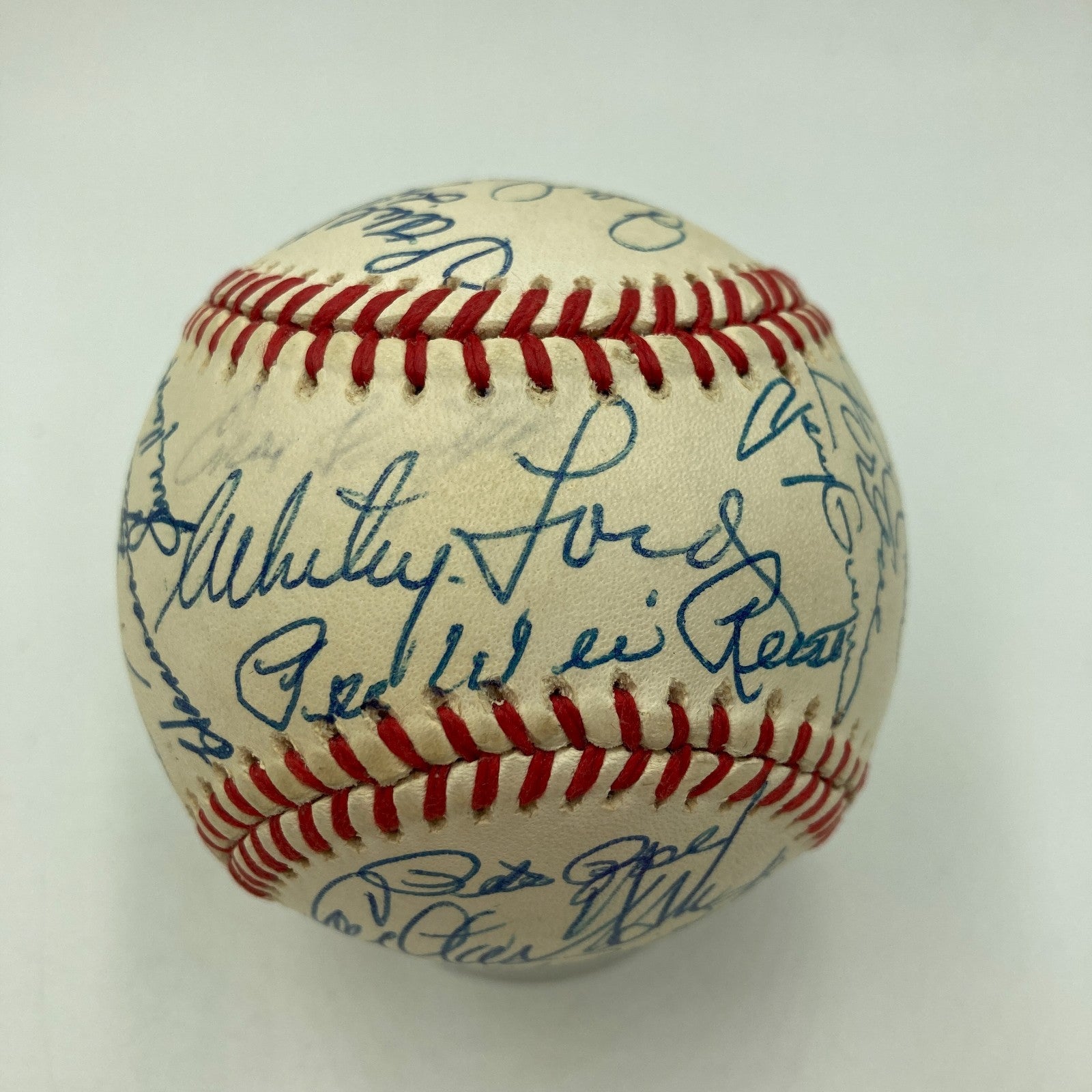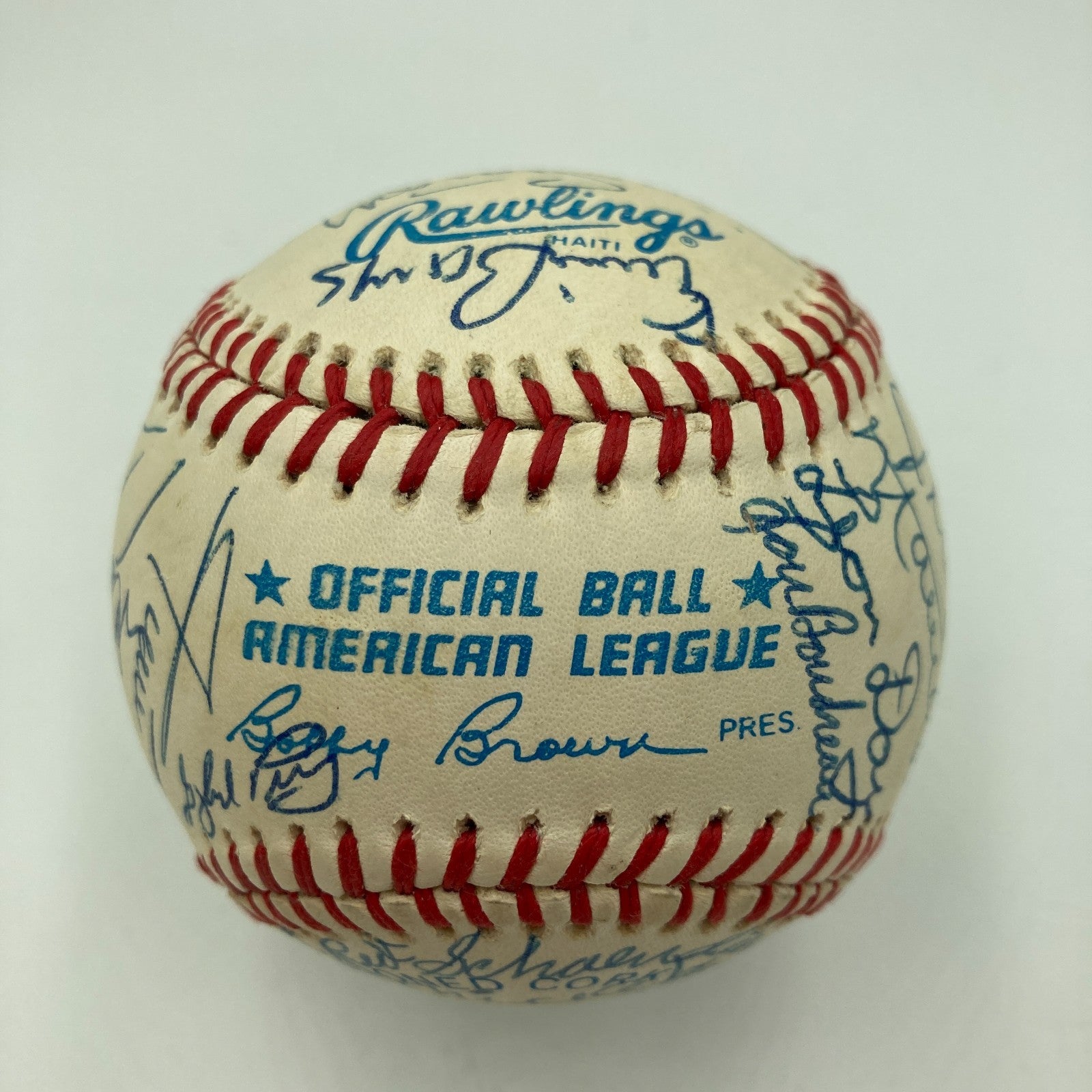 Beautiful Hall Of Fame multi signed American League Baseball. 30 signatures with: Mickey Mantle, Billy Williams, Tony Gwynn, Whitey Ford, Pee Wee Reese, Sandy Koufax, Carl Yastrzemski, Ernie Banks, Carlton Fisk, Jim Hunter, Warren Spahn, Reggie Jackson, Willie Mays, Whitey Ford, Willie Stargell and others.