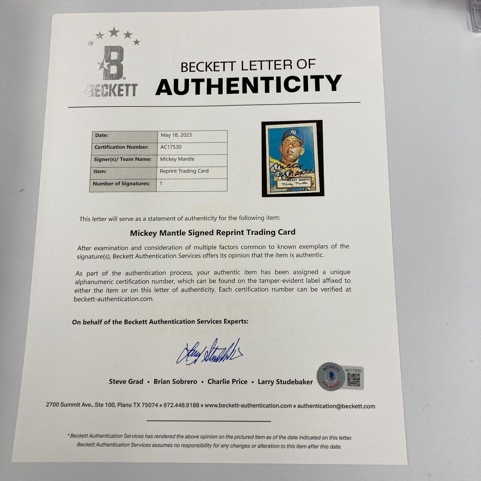 Signed 1983 Topps '52 Reprint Mickey Mantle Signed Card. Presented is a '52 Topps Mickey Mantle card from the 1983 Topps reprint set that has been signed by The Mick. Signed in bold black sharpie. PSA DNA authenticated. Full LOA from Beckett Authentication Services.
