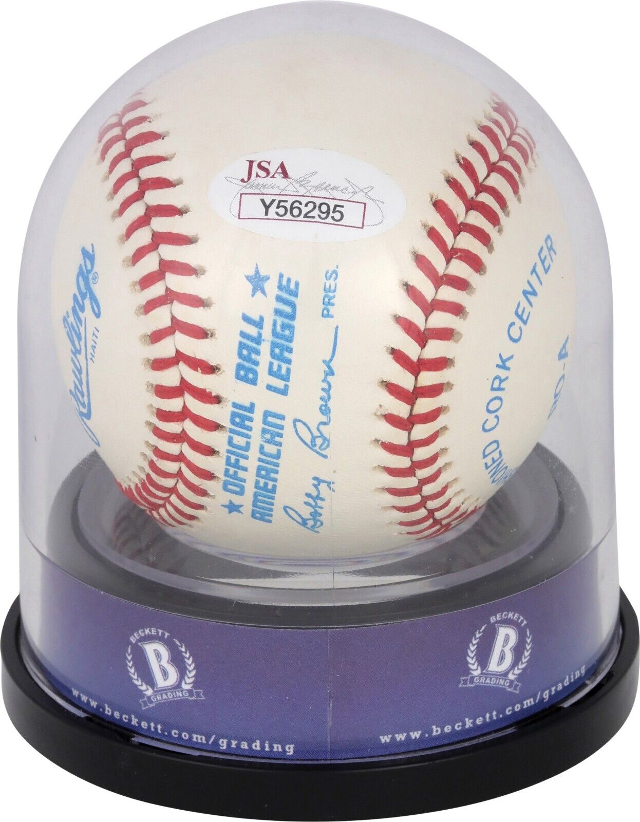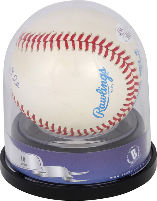 Presented is a Mickey Mantle single-signed baseball. This Official American League baseball is in near mint condition and has been signed by Mantle on the sweet spot with blue ink. The signature has been graded a perfect 10 by Beckett. A JSA authentication sticker is attached to the back of the ball. Mantle played for the Yankees from 1951 to 1968. He hit 536 home runs in his career and was inducted into the National Baseball Hall of Fame in 1974.