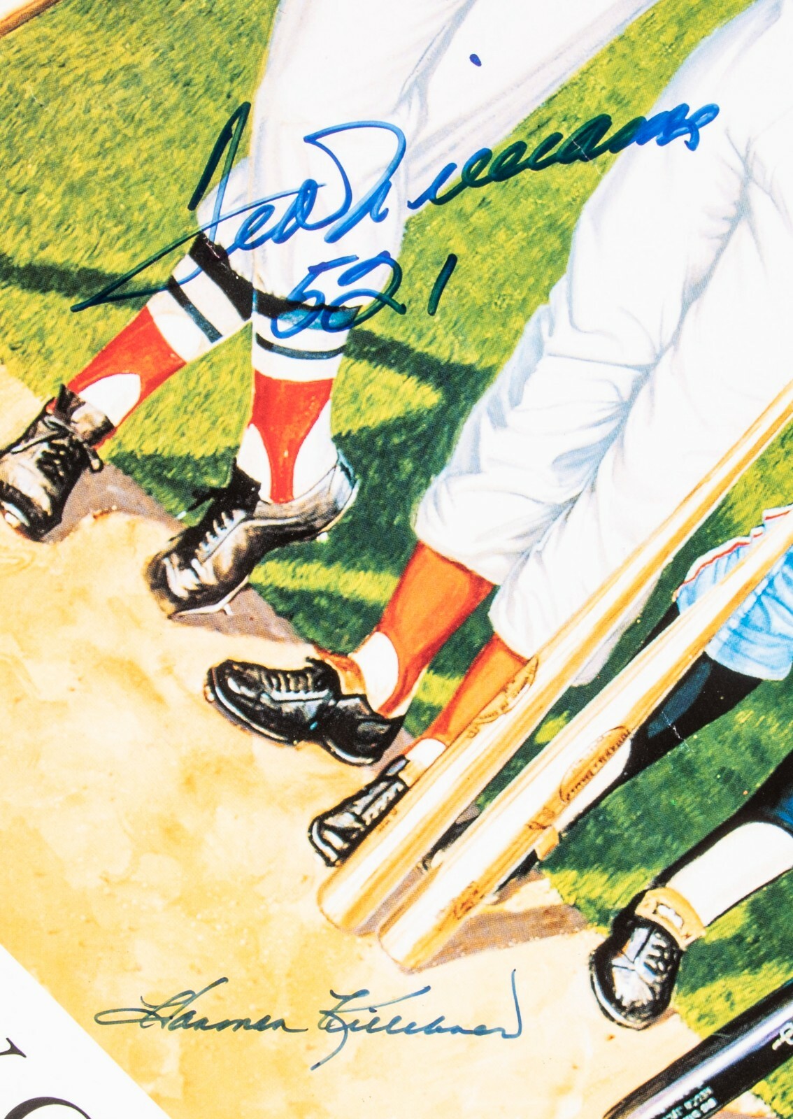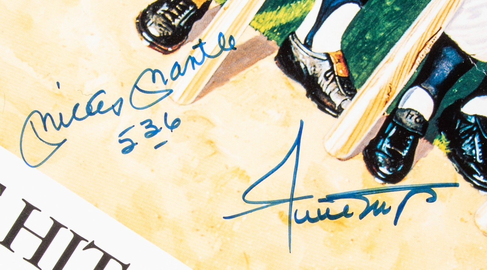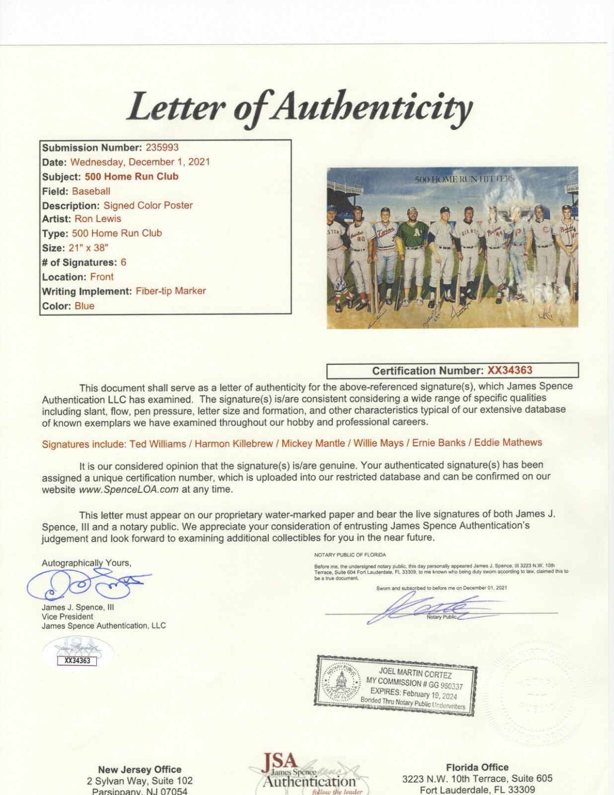 Presented is a Major League Baseball “500 Home Run Club” multi-signed poster of a painting by artist Ron Lewis with six signatures including Hall of Famers Ted Williams, Mickey Mantle, Willie Mays, Ernie Banks, Eddie Matthews and Harmon Killebrew. The six MLB stars signed their names in blue marker on the front of the 21 x 38-inch color poster vertically either on or below their respective images. The signatures, from left to right, include Williams (with the inscription “521”), Killebrew, Mantle (with the inscription “536”), Mays, Banks and Matthews. Lewis’s painting features 11 players, from left to right, including Williams, Frank Thomas, Killebrew, Reggie Jackson, Mantle, Mays, Hank Aaron, Mike Schmidt, Banks, Matthews, and Willie McCovey. The poster bears the legend “500 Home Run Club” across the top center in black type, with the legend “Courtesy of Pete Rose Hit King Marketing Inc./Capital Cards” across the bottom margin in black type. The poster print is from 1988 and captures the elite living members of the 500 Home Run Club, missing only the late Babe Ruth. This item comes with an LOA from JSA (XX34363). The photo has HEAVY CREASING.