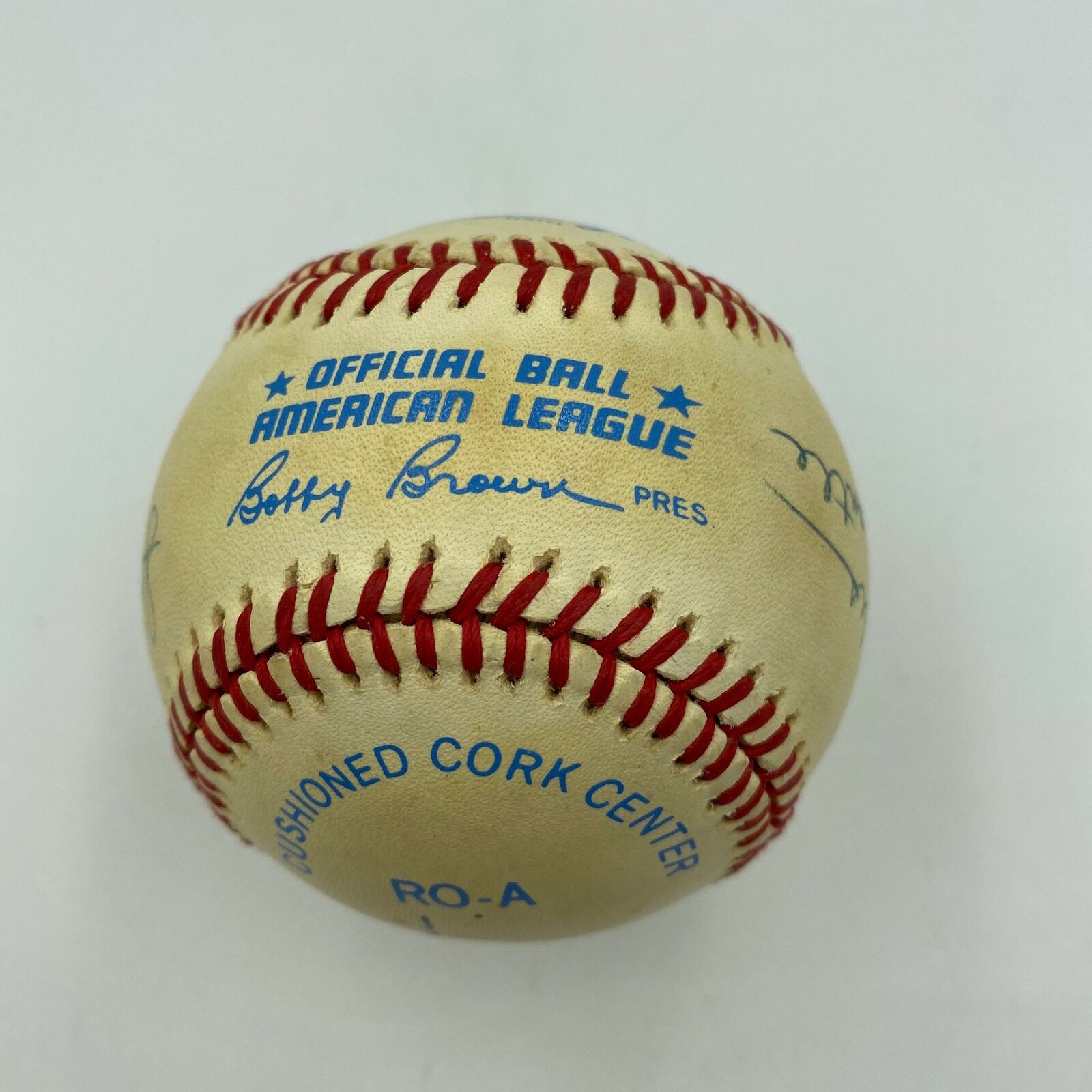 Rare Mickey Mantle, Whitey Ford, Willie Mosconi signed American League Baseball. Inscribed by Mosconi "Mickey & Whitey Party Atlantic City 10-21-1984".